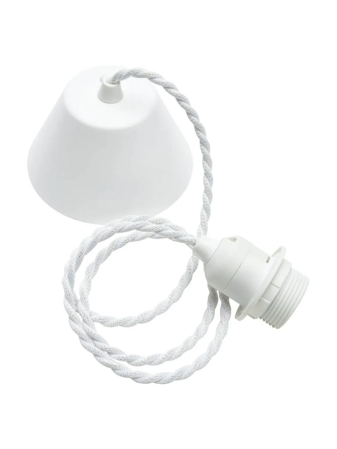 Takupphänge med tvinnad vit textilsladd från PR-Home 1,2m lång, vit E27 lamphållare med ringfäste, vit takkopp och en kopplingsplint. Takkontakt ingår ej.