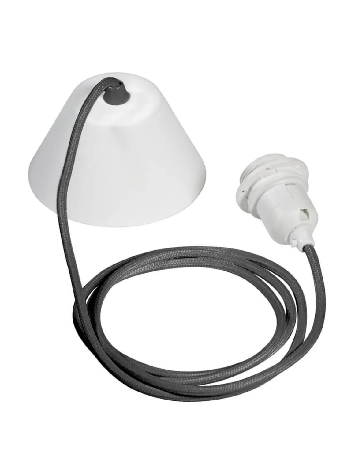 Vitt takupphäng som har 2,1 meter lång grå textilkabel och ett E27 ringfäste. Med kopplingsplint från PR-Home