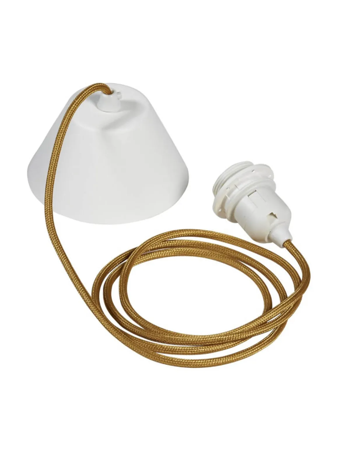 Vitt takupphäng som har 2,1 meter lång guldfärgad textilkabel och ett E27 ringfäste. Med kopplingsplint från PR-Home