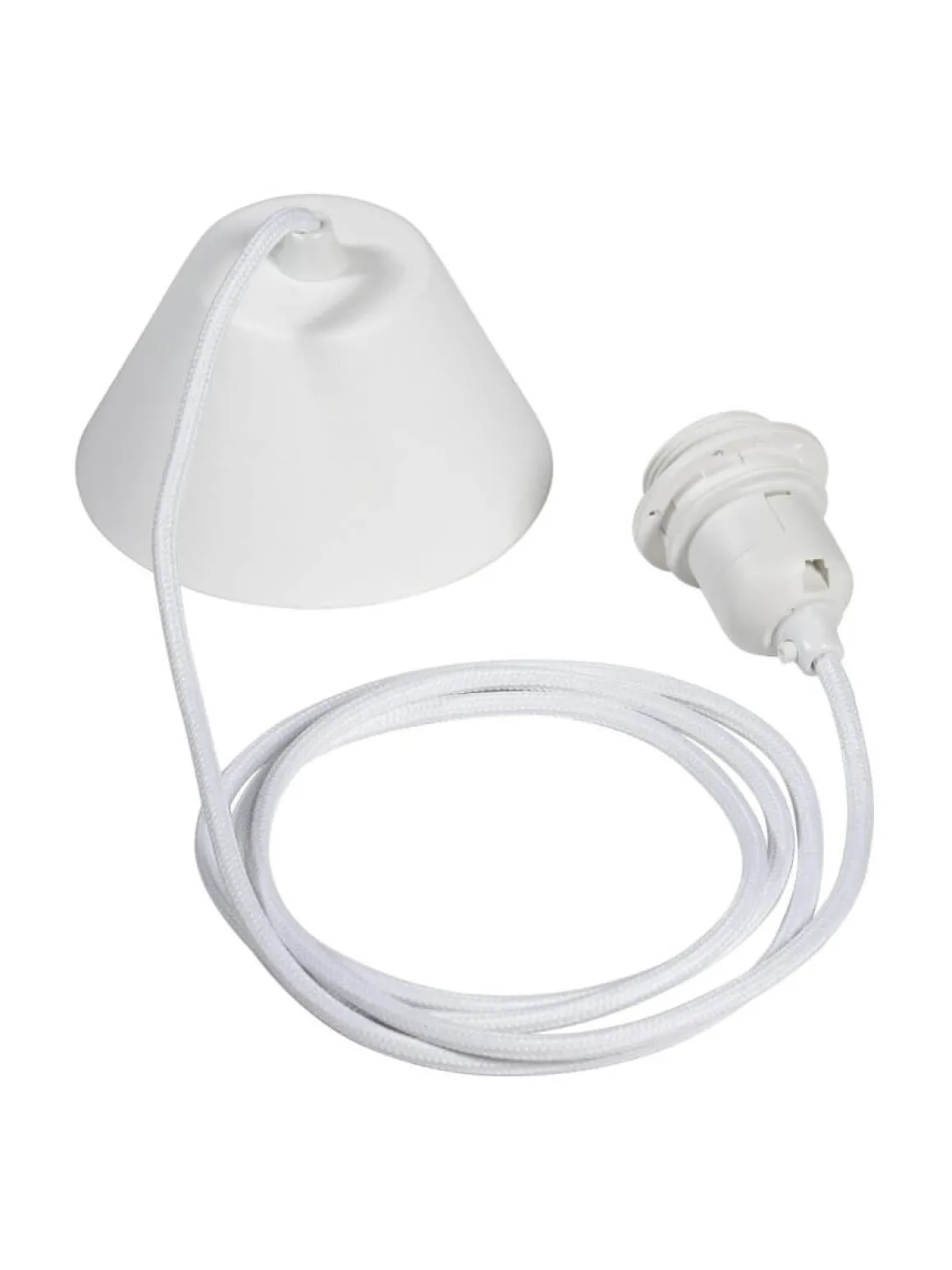 Vitt takupphäng som har 2,1 meter lång textilkabel och ett E27 ringfäste. Med kopplingsplint från PR-Home