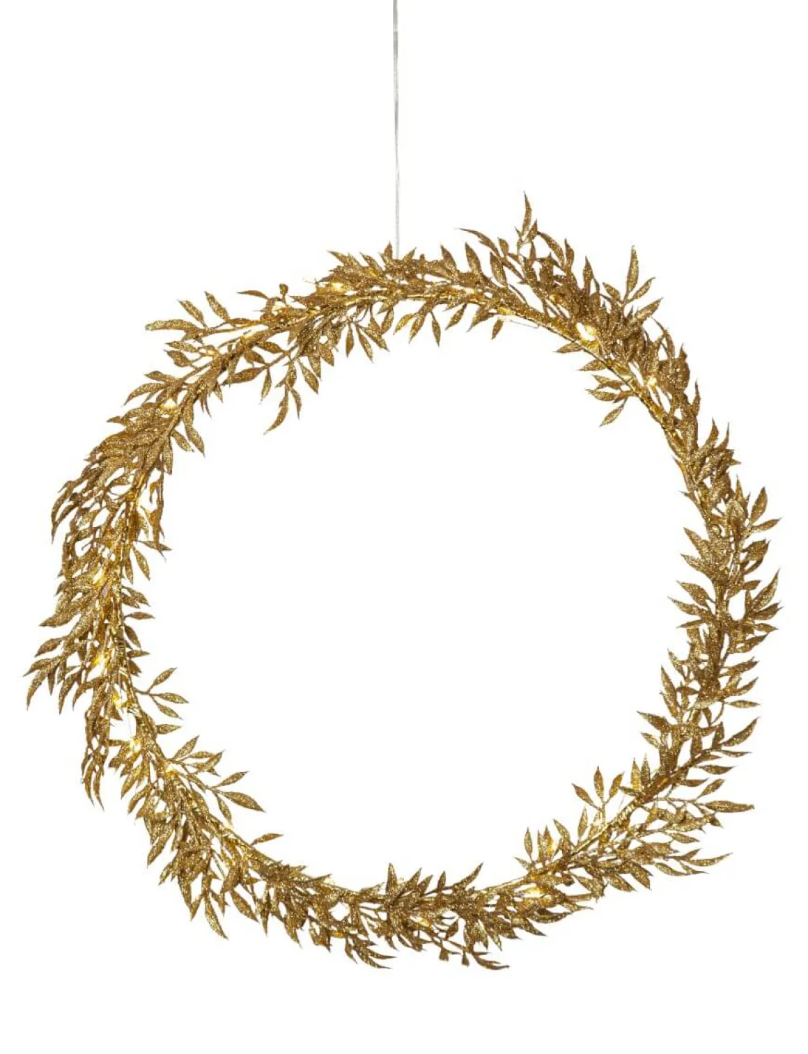 Lyxig guldfärgad julkrans från Star Trading att hänga mot en vägg eller i ett fönster. Kransen har guldglitriga löv som ger ett fylligt och glamoröst intryck. 50 små varmvita led ljuspunkter lyser stämningsfullt i kransen. Dekorera till jul eller vid andra festliga tillfällen.