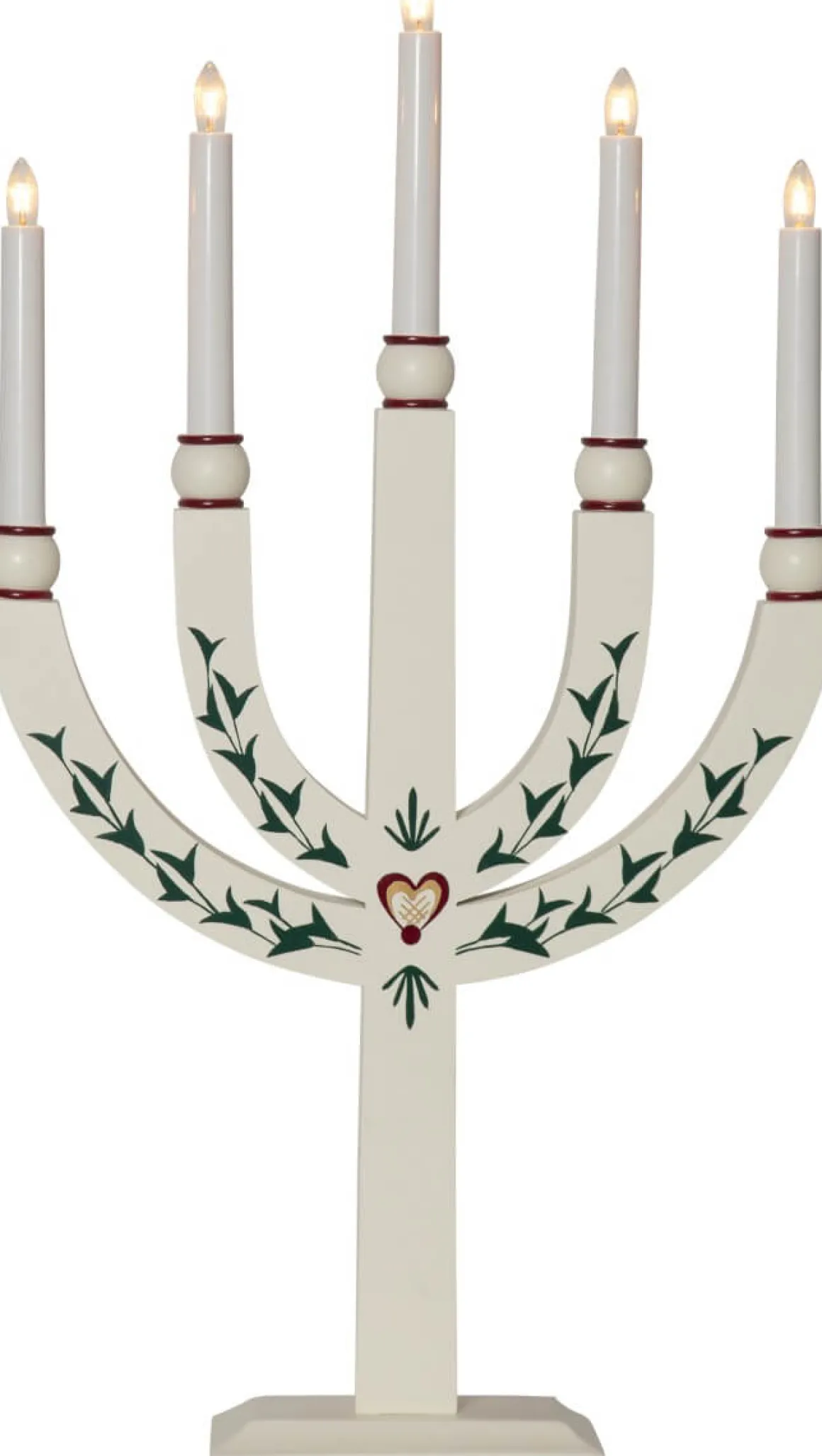 Stilren vit träljusstake med enkla former som har vart en stor kundfavorit i butiken i många år. Nu i ny design med vackert målade mönster längs med kroppen. Otroligt vackert!