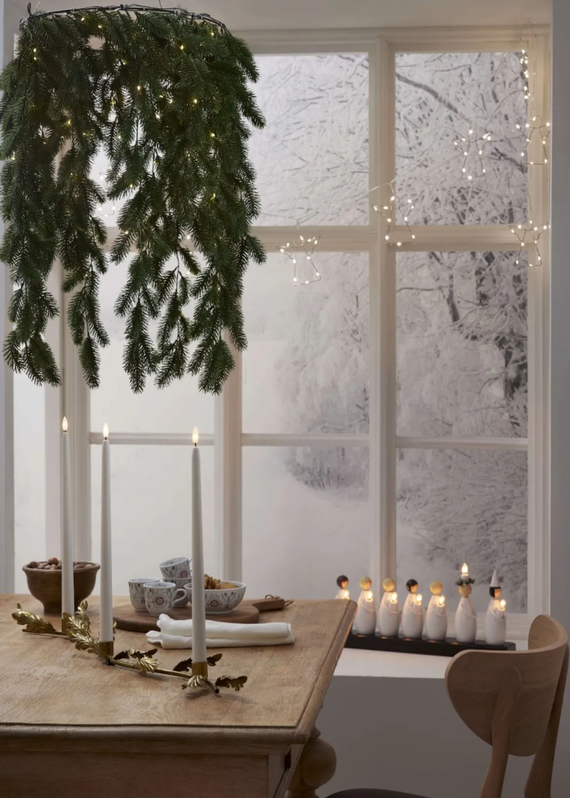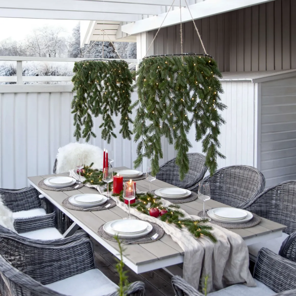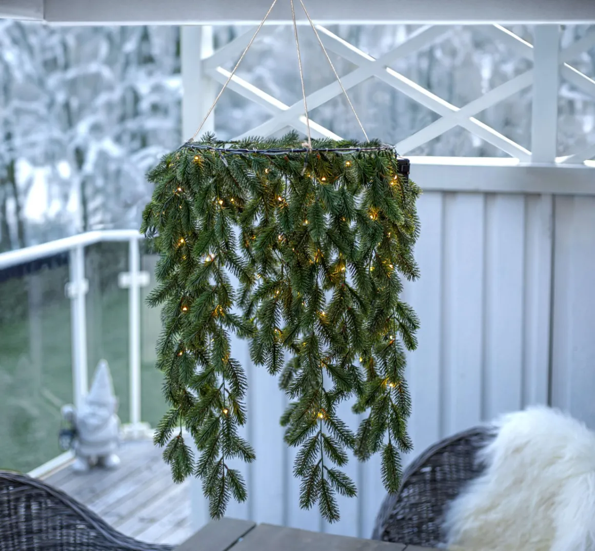 Erna är en vacker krans med mörkgröna, naturtrogna barr i PE-material. Den hänger horisontellt och pryds av 80 varmvita dew-drop LED-lampor som skapar en mjuk, stämningsfull belysning. Drivs av 3 AA-batterier (ingår ej) och har en inbyggd timerfunktion för enkel användning. Perfekt för att skapa julstämning i ditt hem!
