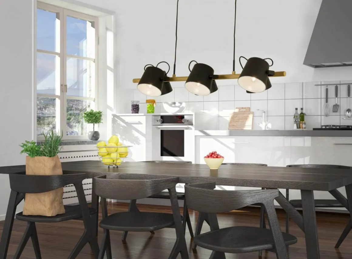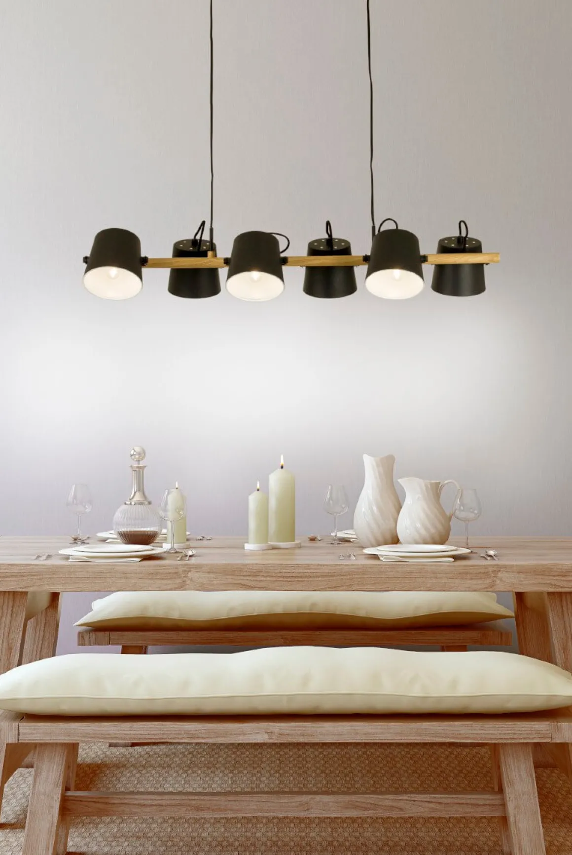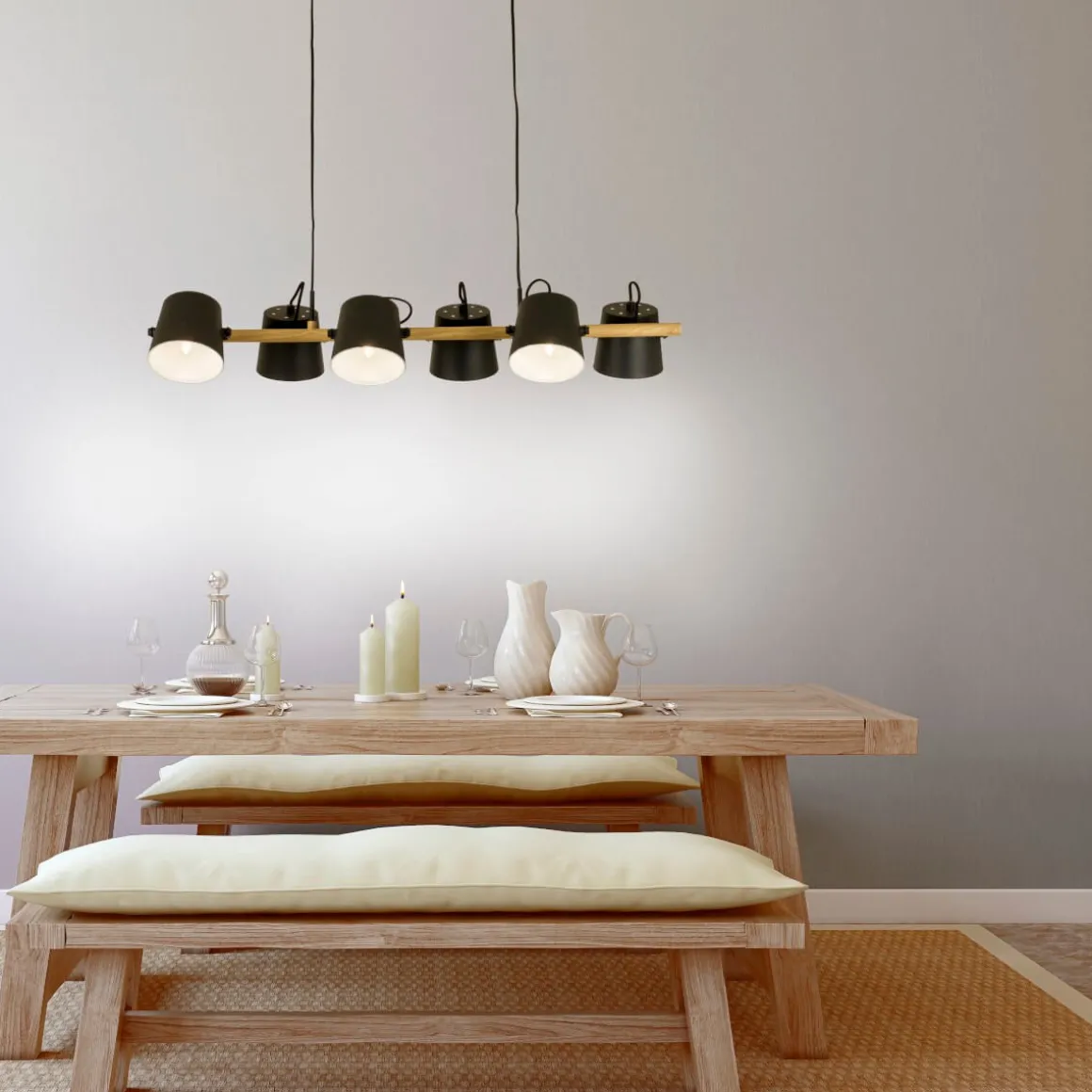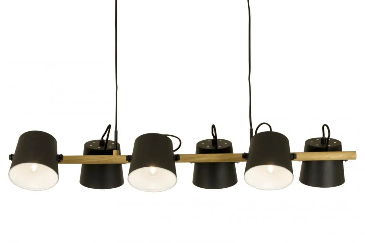 Spännande taklampa från Aneta belysning perfekt för det lite större matsalsmöblemanget eller för dig som vill göra ett stort intryck. 6 stycken riktbara metallkupor 2 på vardera sida om den naturfärgade stommen. Självklart med krokupphäng för en snabb och smidig installation.