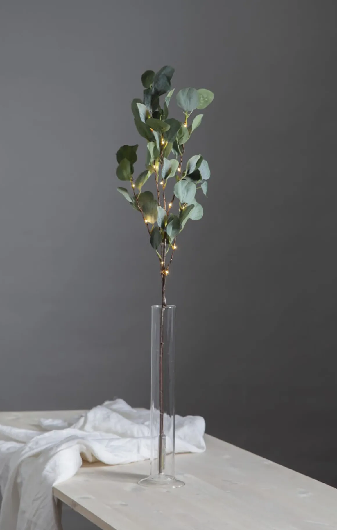 Dekorationskvist i Eucalyptus med 15 stycken små varmvita dioder vackert invävda bland bladen. Drivs med batteri och har självklart en inbyggd timer så du enkelt kan bestämma när du vill att den ska lysa.