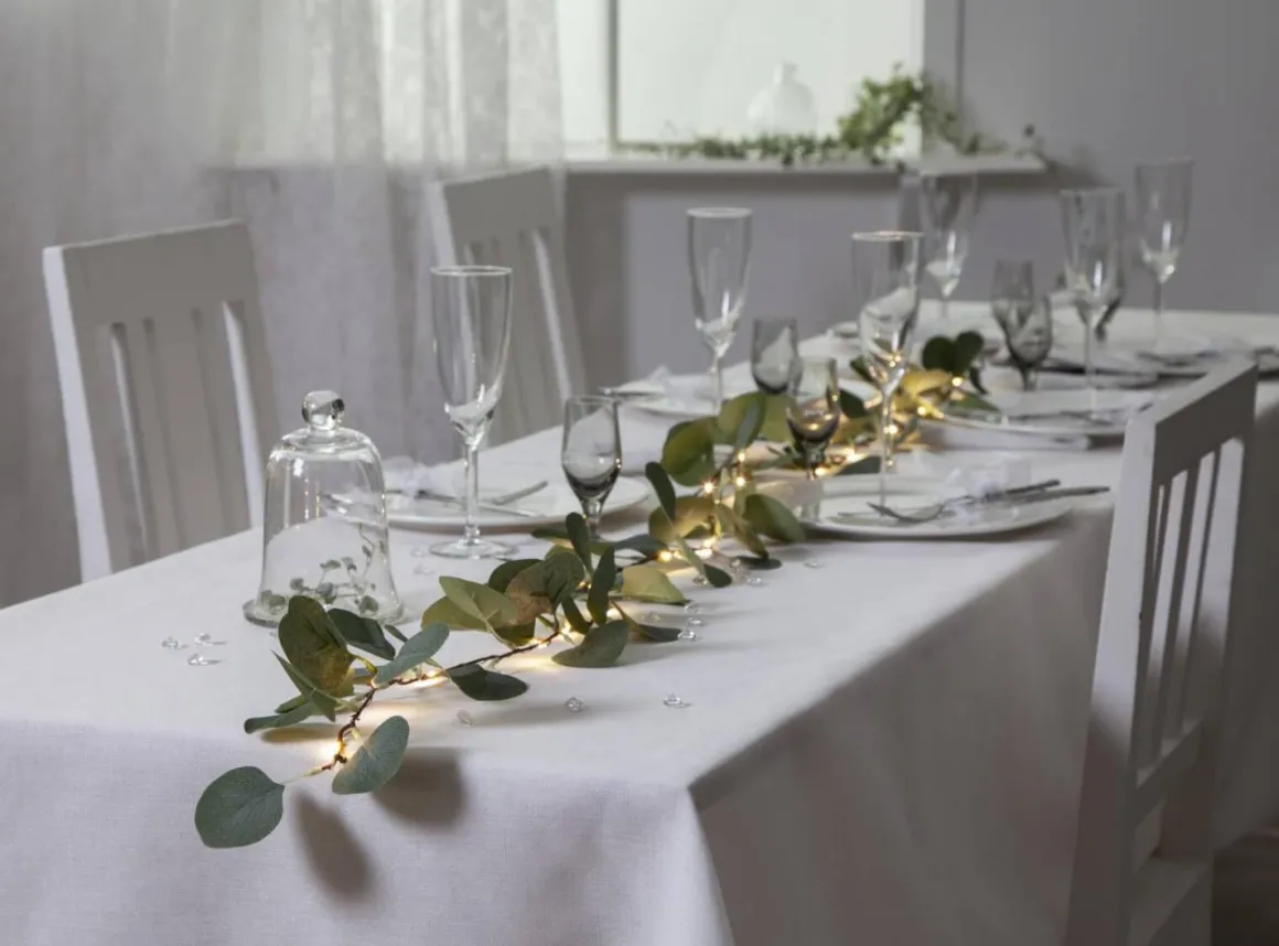 Vacker dekorationsgirlang pyntad med eukalyptus blad runt en härlig dew drop slinga på 180 cm. Perfekt att ha som bordsdekoration.