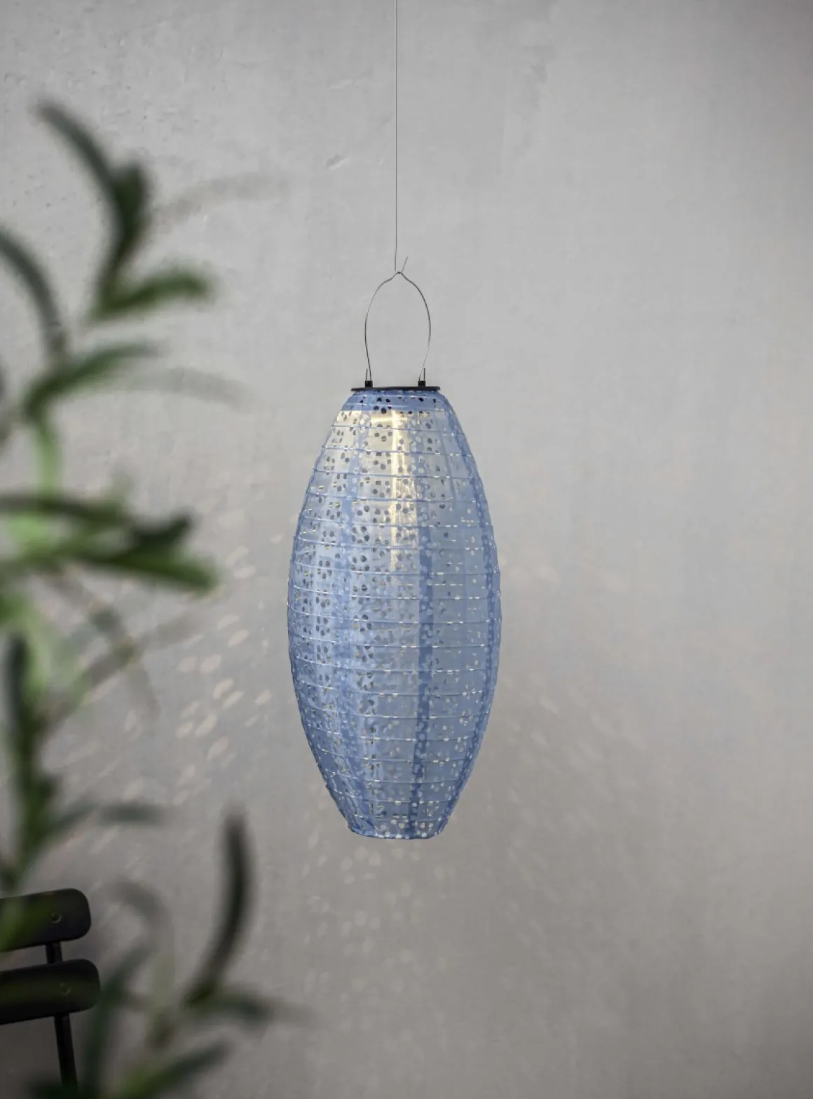 Solcellslyktan Festa är tillverkad av blå polyester med ett hålmönster som skapar ett vackert skuggspel när den lyser i mörkret. Den är en fantastisk dekoration för trädgården, terrassen eller balkongen. Festa finns i två modeller och tre färger, och denna specifika modell har en diameter på cirka 20 cm och nära 40cm i höjd. Placera lyktan så att solen kan nå panelen under dagen för optimal laddning av det medföljande batteriet. En perfekt detalj för att lysa upp din utomhusmiljö!