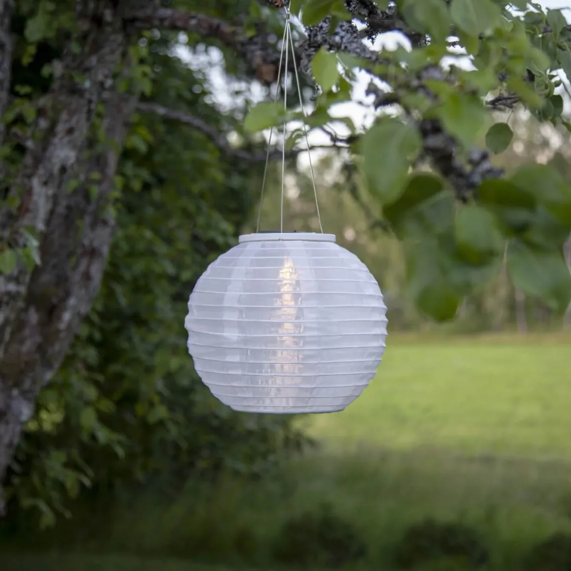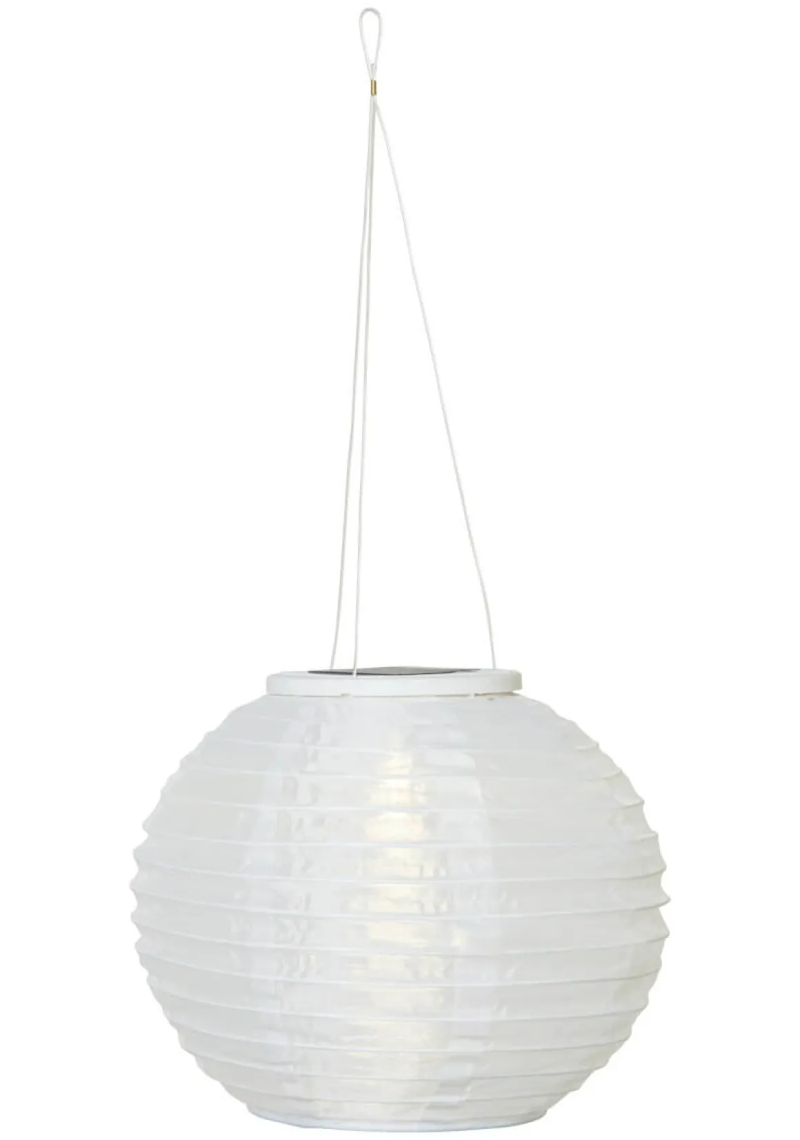 Vit ”Risboll” i polyester som drivs med solens varma strålar, tänder per automatik när mörkret kryper på, bollen är 25 centimeter i diameter och cirka 20 centimeter hög.