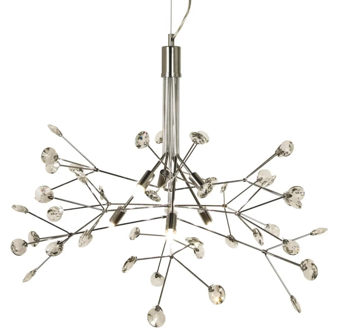 Härligt nytänkande kristallkrona med en avskalad modern design, kromad stomme med en härligt glittrig kristall i varje grentopp, sex stycken G9 ljuskällor ger dig allt ljus du kan tänkas behöva. (ljuskällor ingår ej)
