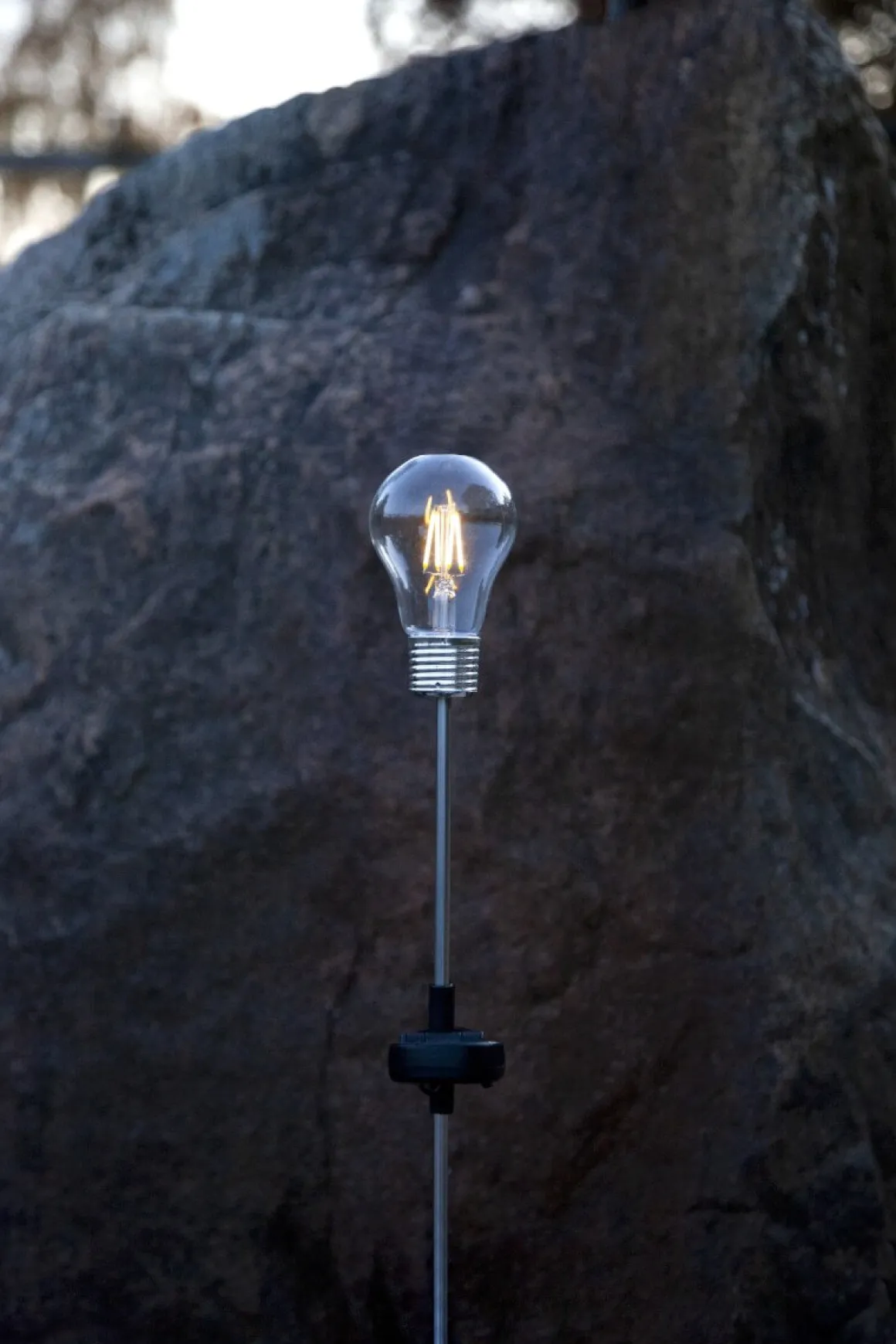 Festlig solcells pinne med en varmvit lysande glödlampa på toppen. Lampan laddas med solen och tänds automatiskt när mörkret faller.