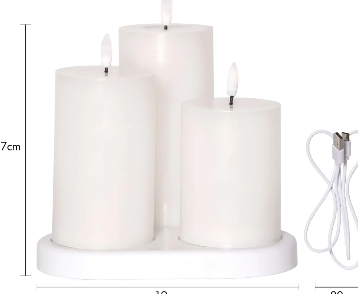 Flamme Charge från Star Trading är ett set med 3st vita Blockljus som är uppladdningsbara. Den tillhörande laddningsplattan har även en medföljande 80cm lång kabel med USB kontakt som enkelt går att kopplas in i en 5V adapter, adaptern ingår inte. Indikationslampan i varje ljus lyser röd under laddning och grön när ljuset är färdigladdad. Även om litium batterierna har överladdningsskydd så Låt EJ ljusen ladda längre än 3 timmar max!