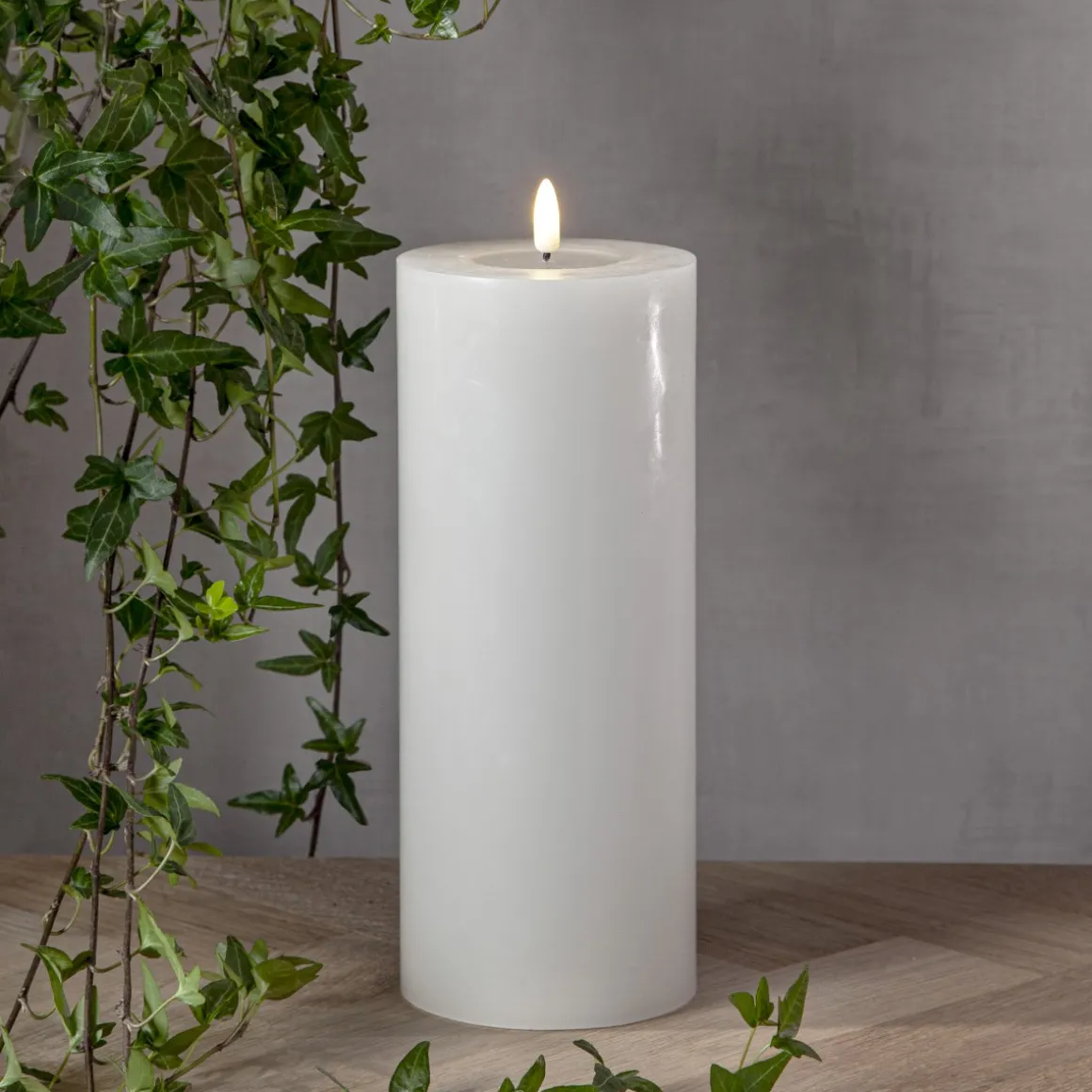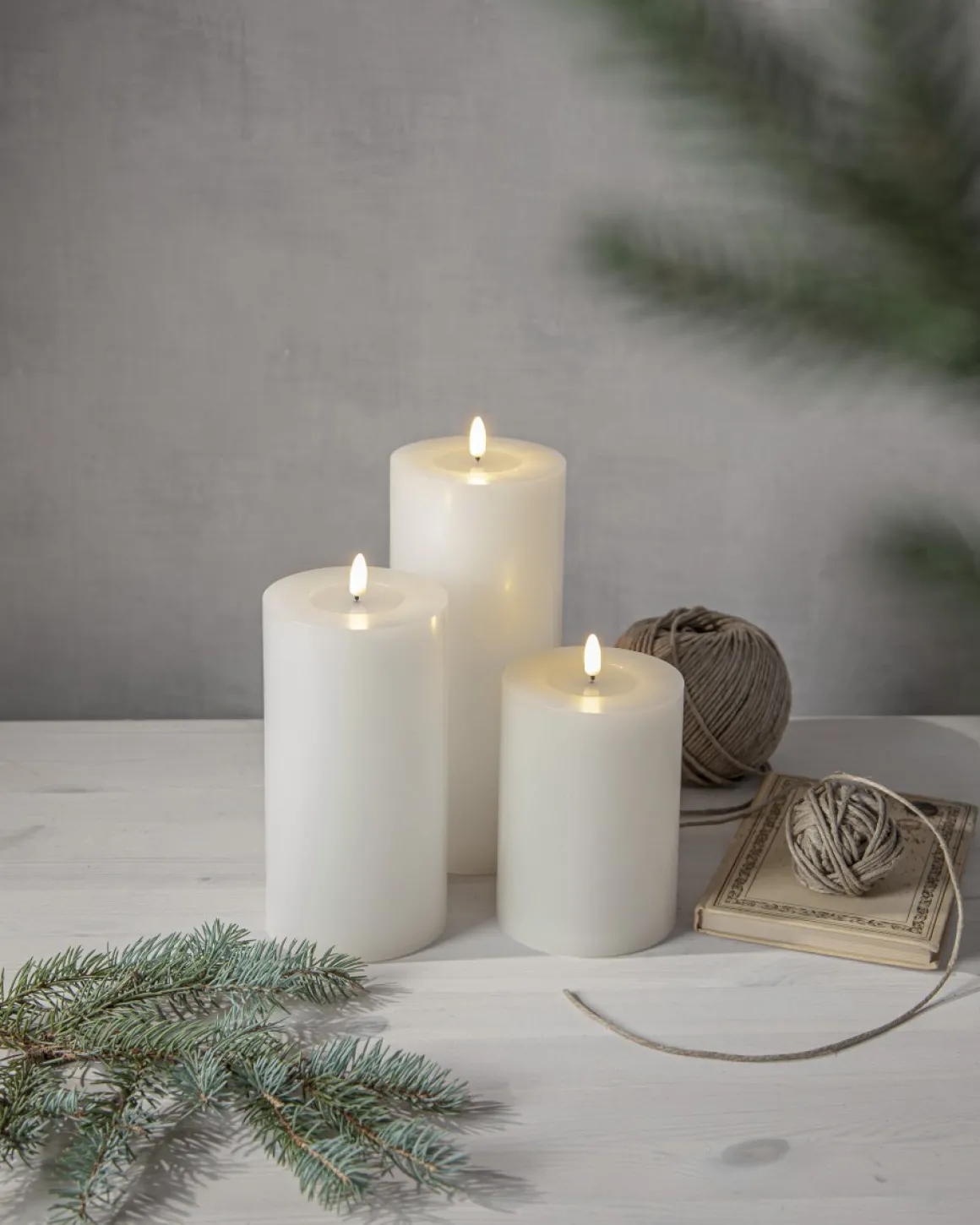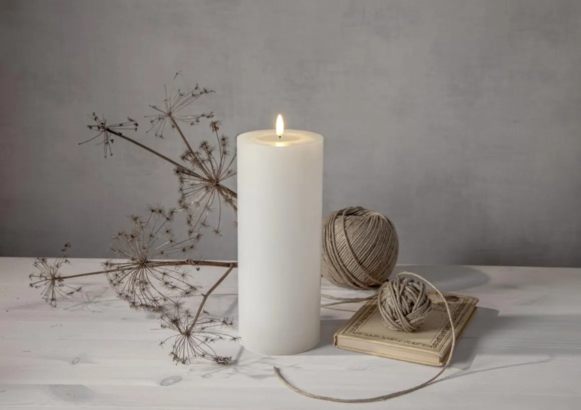 Flamme Flow big är ett batteridrivet blockljus med den naturtrognaFlamme lågan. Detta stearinljus har en blank nedsänkningprecis under lågan, detta gör att ytan ser ut som flytande vax vilket gör ljuset än mer naturtroget. Ljuset är cirka 10cm i diameter och höjden 25cm för vax delen och cirka 27,5cm totalhöjd inklusive lågan. Detta ledljus blir en vacker dekoration, både ensam och i grupp ihop med övriga ljus gärna från Star Tradings Flamme serie. Den drivs av 2 C batterier, batteri ingår ej.