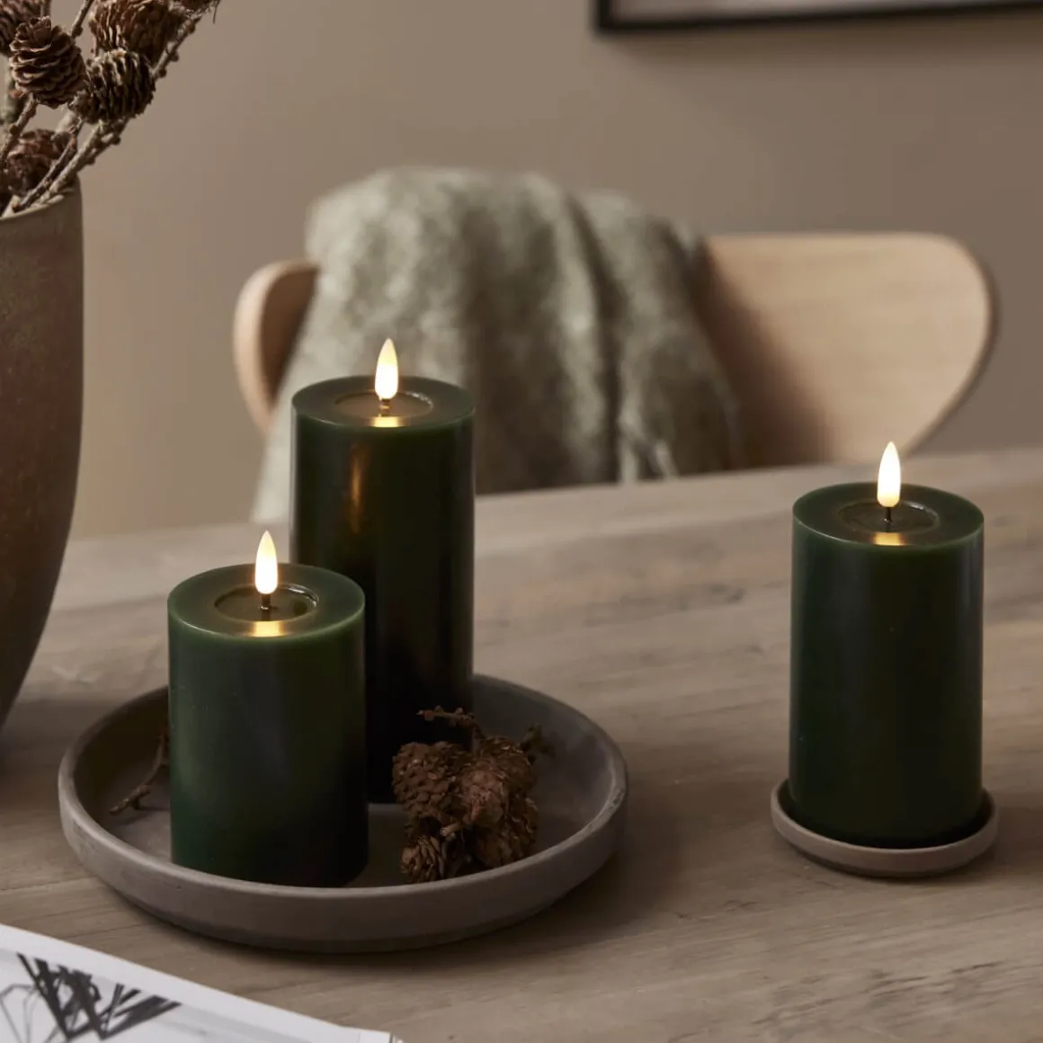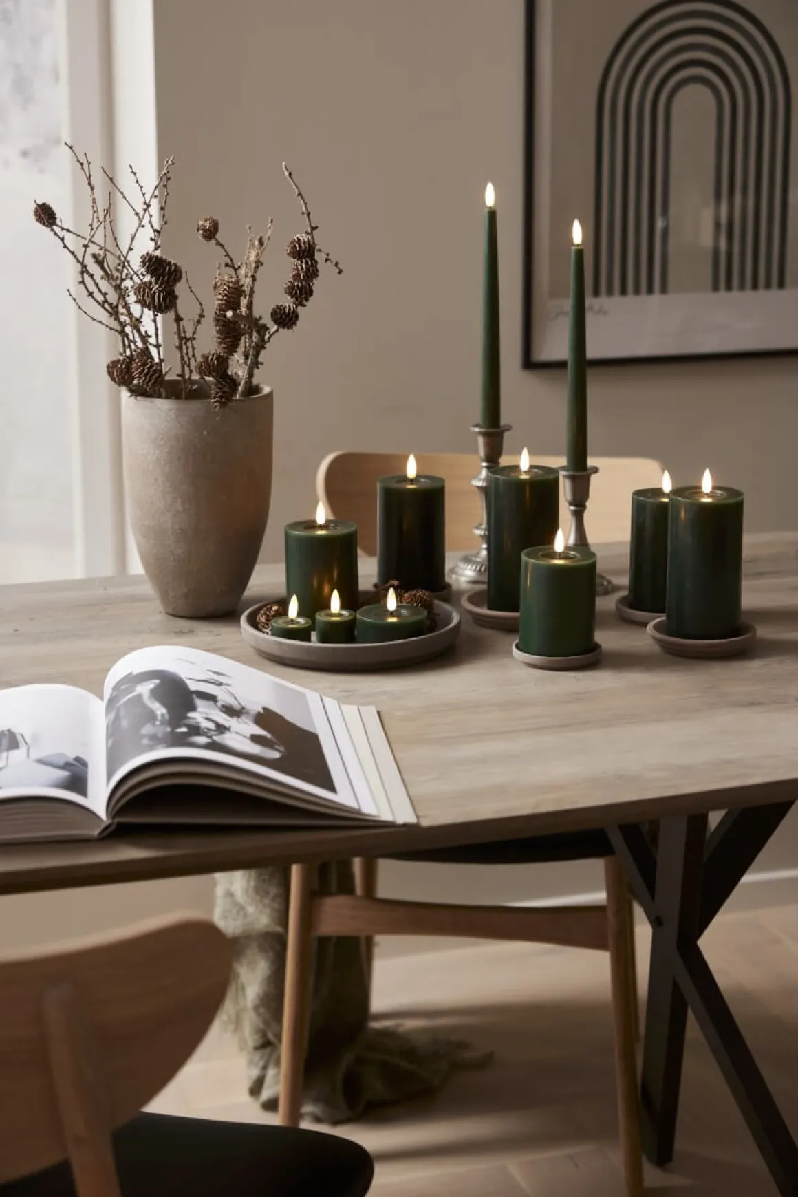 Flamme Flow är ett batteridrivet blockljus med Star Tradings naturtrogna låga Flamme. Detta stearinljus har en blank nedsänkning under lågan vilket gör att denna yta ser ut som flytande vax för en mer äkta känsla.Detta ledljus blir en vacker dekoration, både ensam och i grupp ihop med övriga ljus från Flamme serie. Den har timerfunktion på 6 timmar och när brytaren är på timerläget lyser ljuset i ca 30 dagar med en vacker realistisk låga i varmvitt. Flamme Flow finns i 3 olika höjder och en rad olika färger här ser du den mellersta på 15 cm i Grönt. Den drivs av 2 AA batterier, dessa ingår ej.