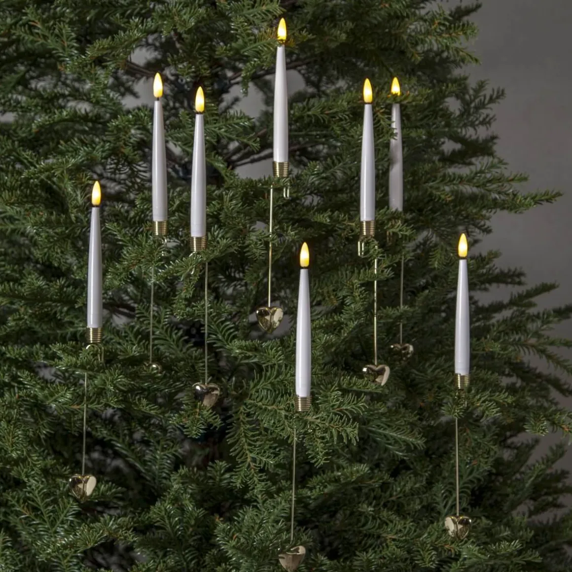 Dekorativ julgransbelysning i form av ett batteridrivet ljus med vackra hållare i metall från Star Trading. Ljusen är endast för inomhusbruk. Hållaren har en krok för enkel montering i julgranen. Längst ner på hållaren sitter ett dekorativt litet gulligt hjärta. Förpackningen innehåller 8 st ljus med hållare. Drivs gör de av ett AAA i varje ljus. Fjärrkontroll med timer funktion, justerbar ljusstyrka och val av fast eller flimrande ljus – toppen helt enkelt.