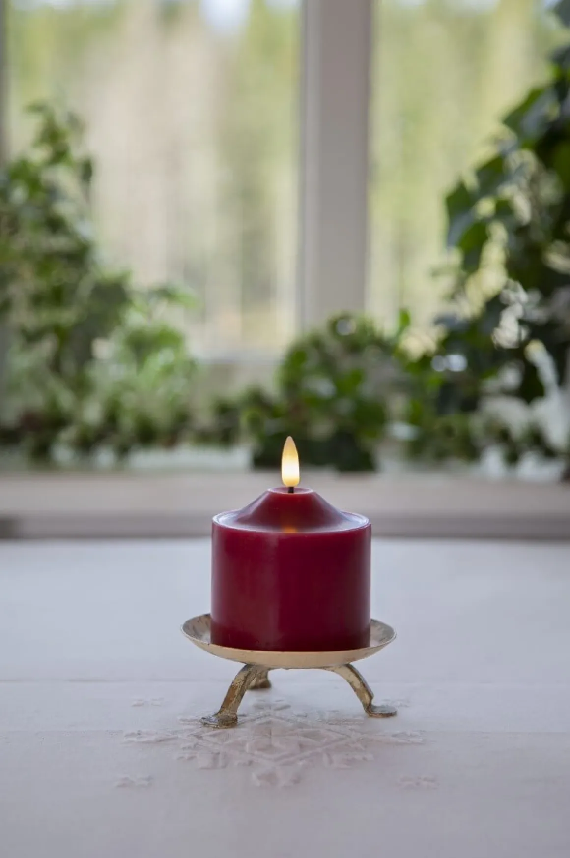 Flamme blockljus är ett vaxljus i mörkröd färg från Star Trading. Ljusets storlek är ca 7,5cm i diameter och höjden inklusive låga är ca 9,5cm. Detta batteridrivna ljus blir en vacker dekoration både ensam och i grupp ihop med övriga ljus från star tradings Flamme serie. Den har självklart timerfunktion och när brytaren är på timerläget lyser ljuset i ca 30 dagar med en vacker realistisk låga i härligt varmvitt ljus. Den drivs av 2 AA batterier, dessa ingår ej.