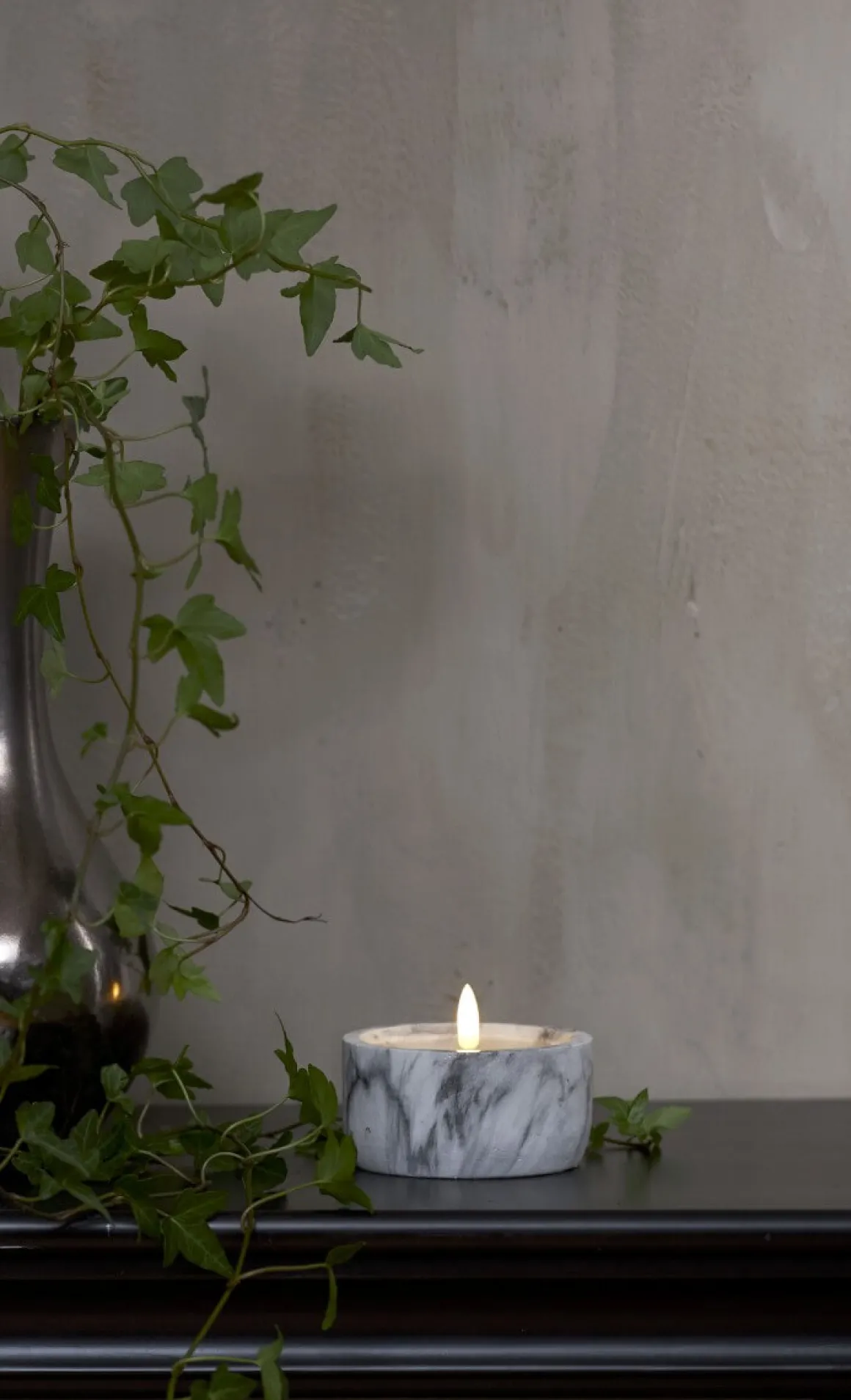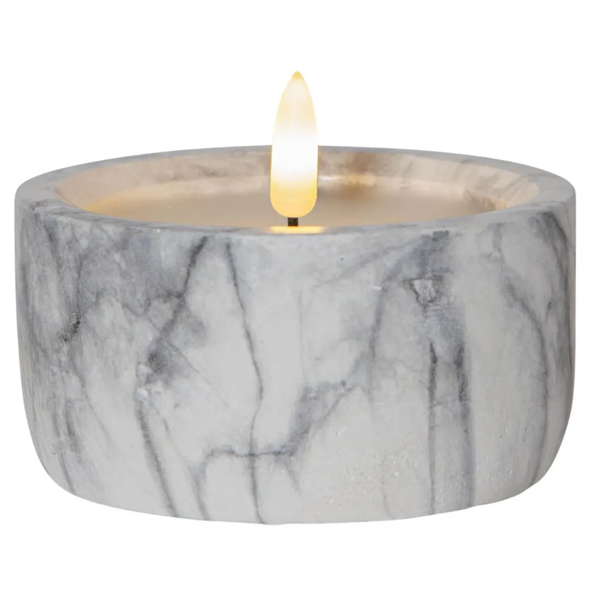 Men har du sett så vackert? Blockljus på 7,5 cm med den otroligt verklighetstrogna lågan Flamme från star trading med ett hölje av marmormönstrad betong. Självklart har ljuset en inbyggd timer så du enkelt kan ställa in när du vill att det ska lysa.