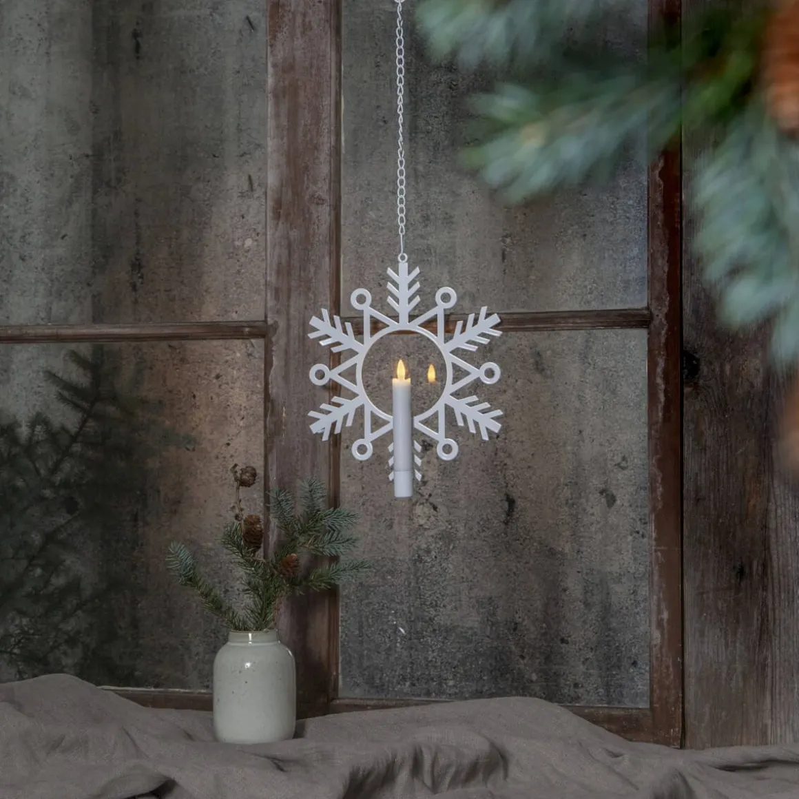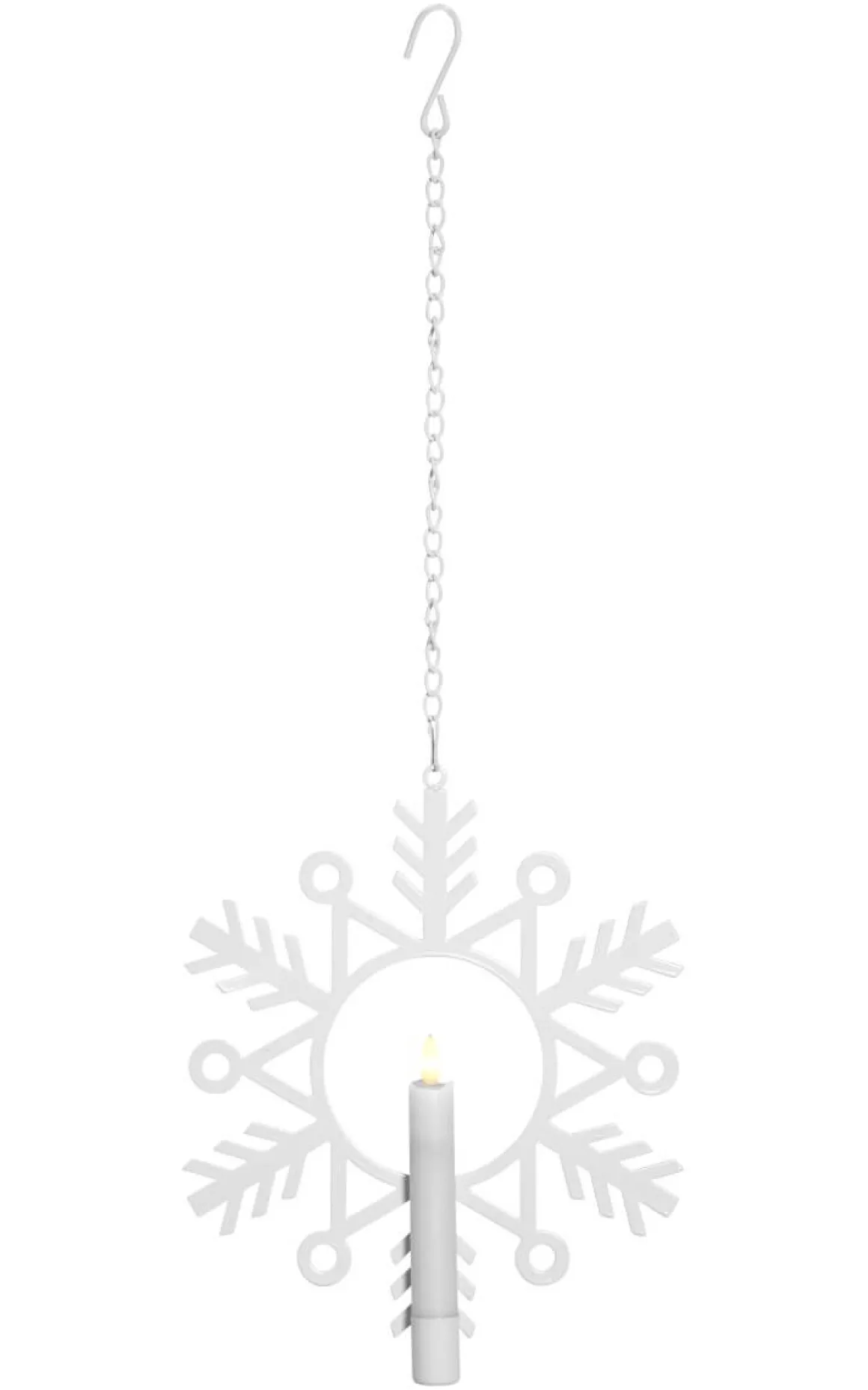 Vit snöflinga i metall med Star Tradings fina antikljus Flamme i 15cm som medföljer. Fin att dekorera med i fönster eller mot en vägg. OBS! Undvik att hänga i direkt solljus då vaxljuset kan smälta utav värmen.