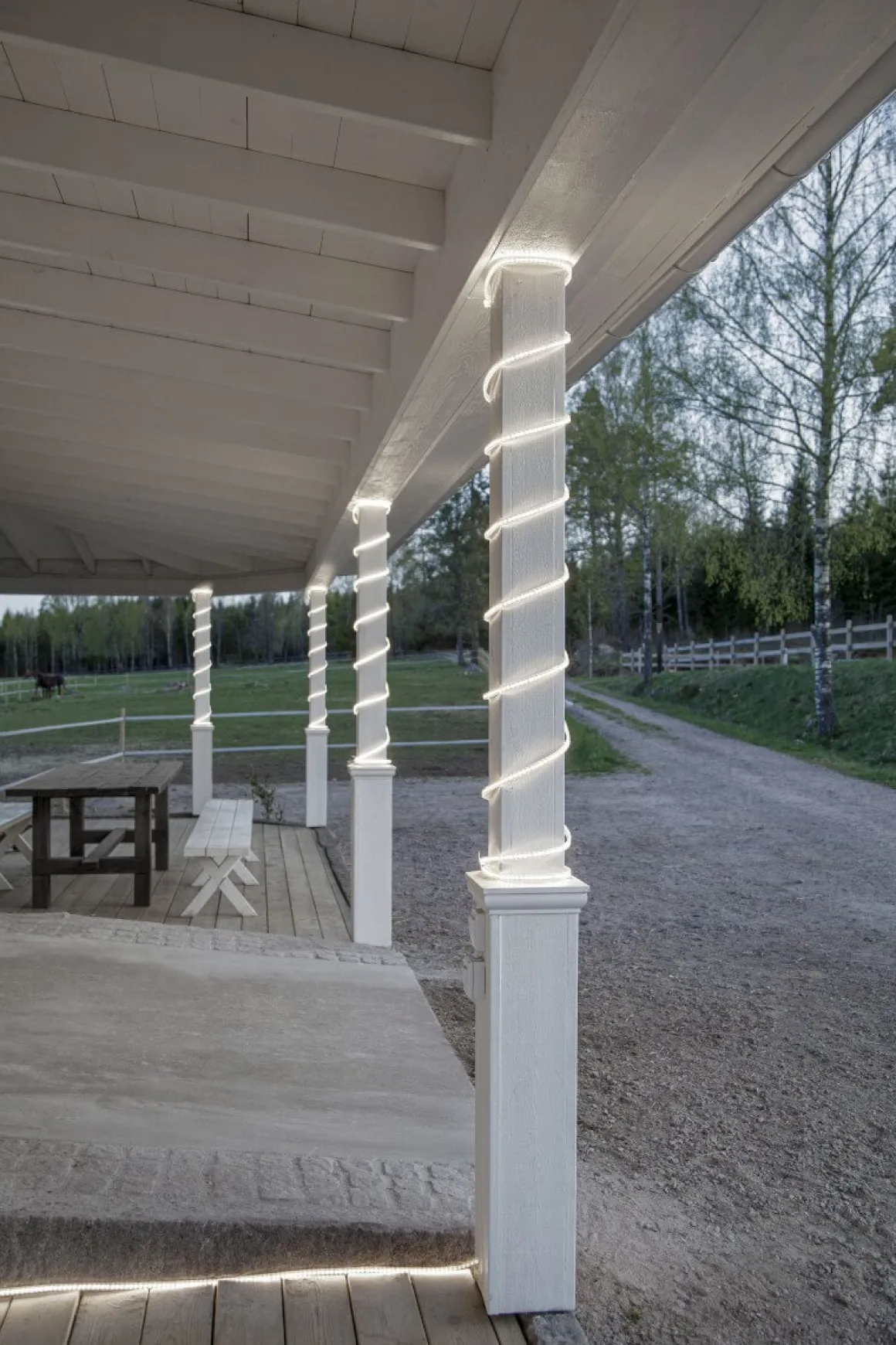 Så läcker ljusslang från Star Trading för utomhusbruk. Slangen är platt istället för rund som de brukar vara och har tätare mellan dioderna för ett jämt och snyggt sken. Denna slingan är hela 10 meter lång och klammer och skruvar ingår i paketet. Som du ser på bilden lyser slingan med ett krispigt kallvitt ljus.