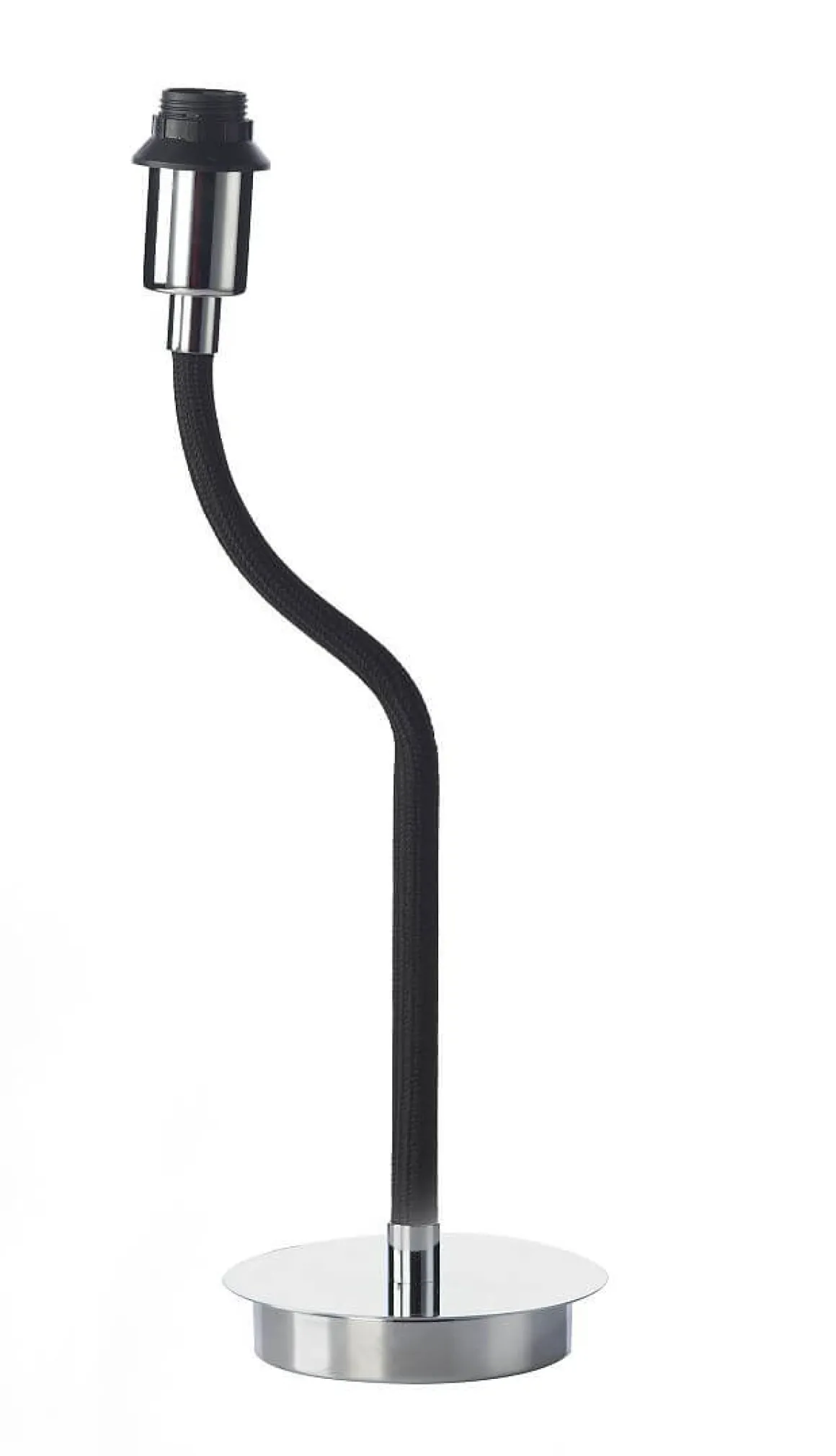 Härligt rolig bordlampa från Oriva med en kromad lampfot och en svart tygbeklädd flexarm som du kan rikta lite som du själv vill. Kombinera med en läcker skärm eller en cool Dekorations LED ljuskälla.