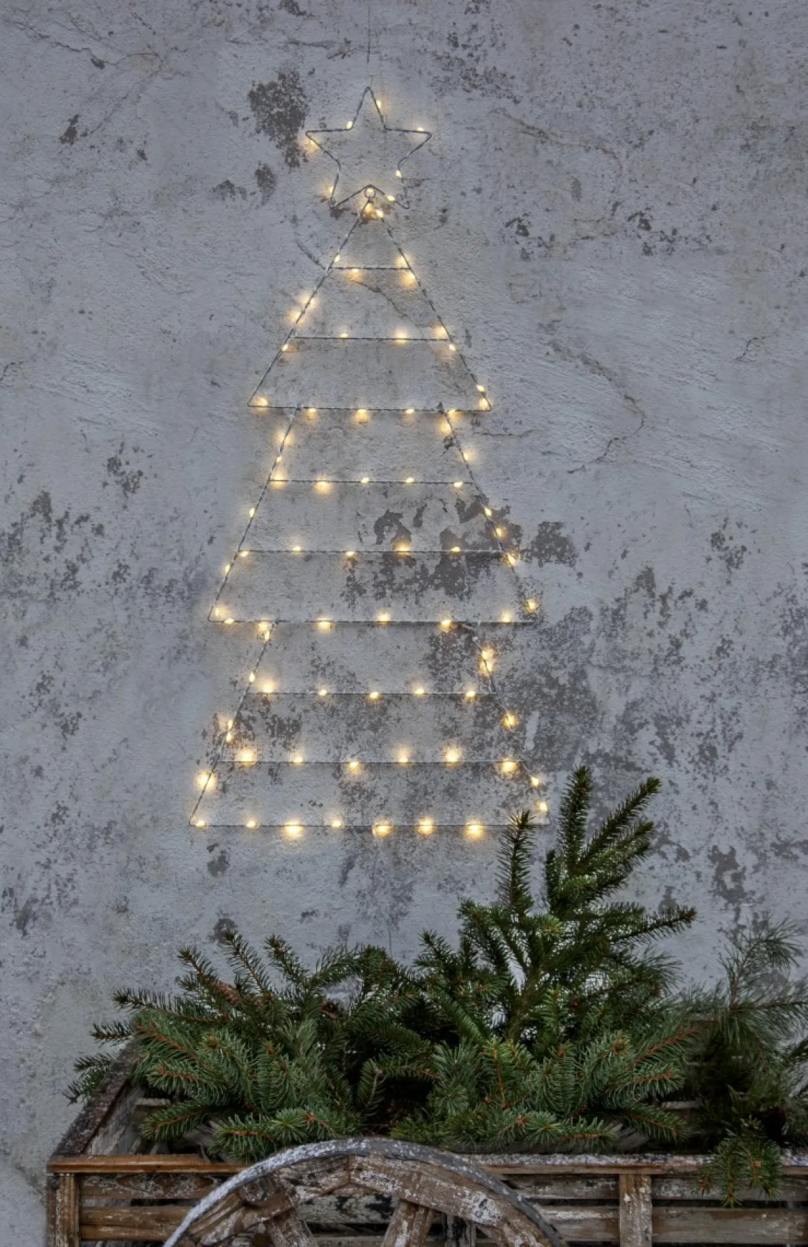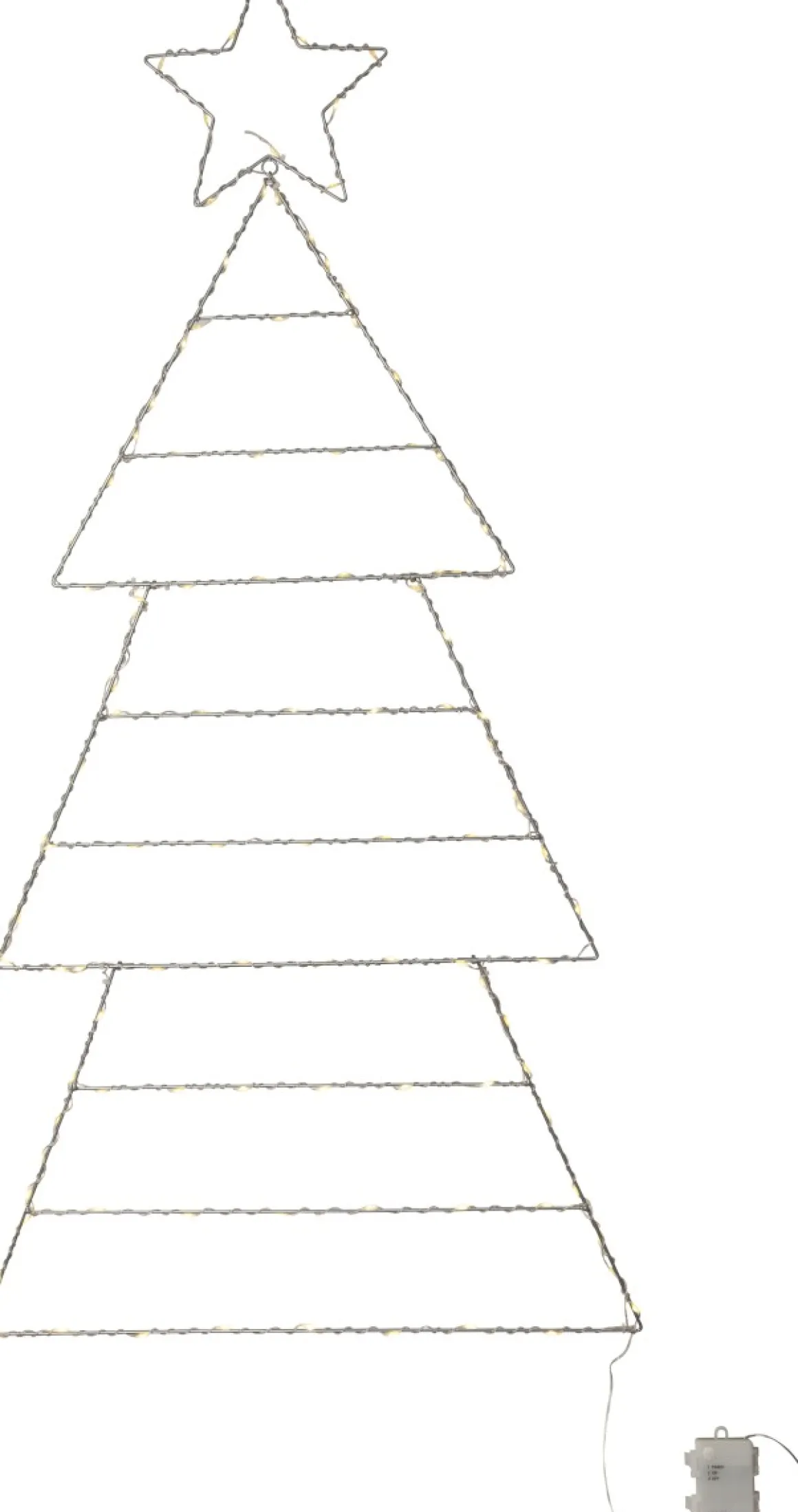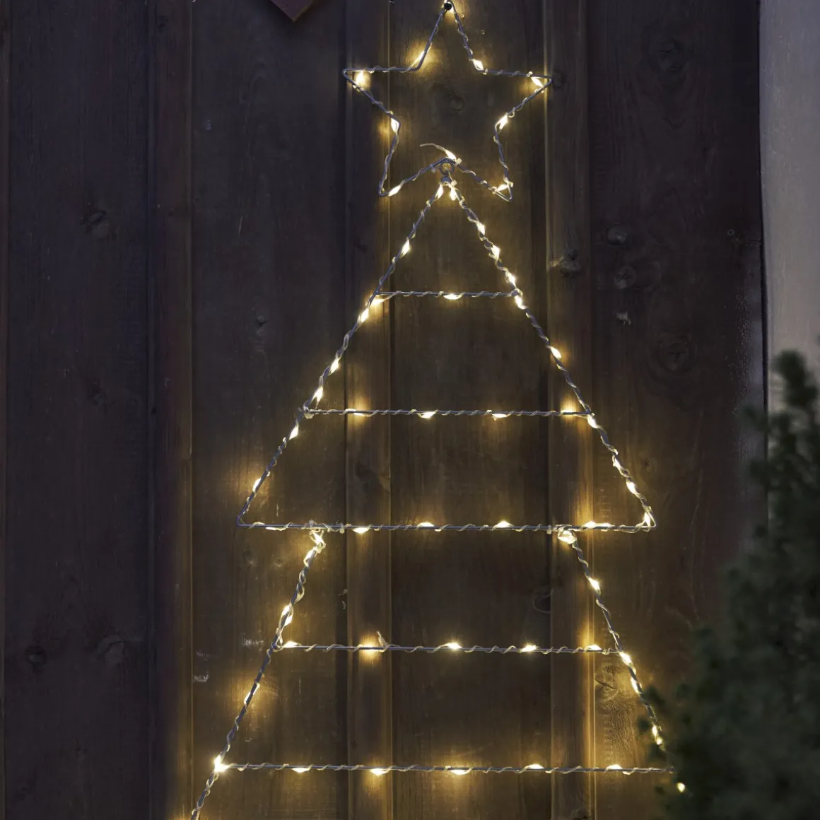 Folde är en metallsiluett formad som en julgran som är 120 cm hög som kan hängas upp på en vägg utomhus. Batteridriven utomhusdekoration med timer funktion. Lättplacerad på vägg eller på marken. 110 varmvita LED ger ett vacket sken i mörkret. När julen är över är det bara att vika ihop granen så den tar mindre plats.
