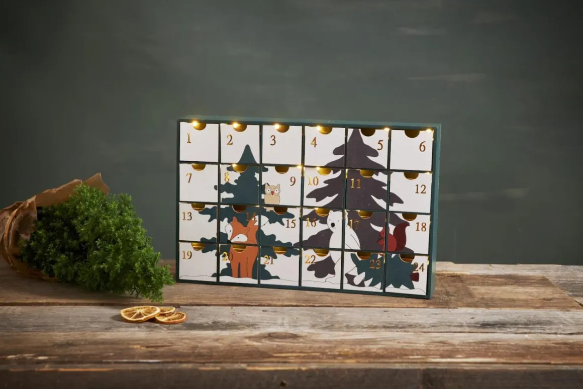 Så söt julkalender med 24 små lådor att gömma någonting roligt i. Motivet på julkalendern tillhör den populära serien Forest Friend från samma leverantör.