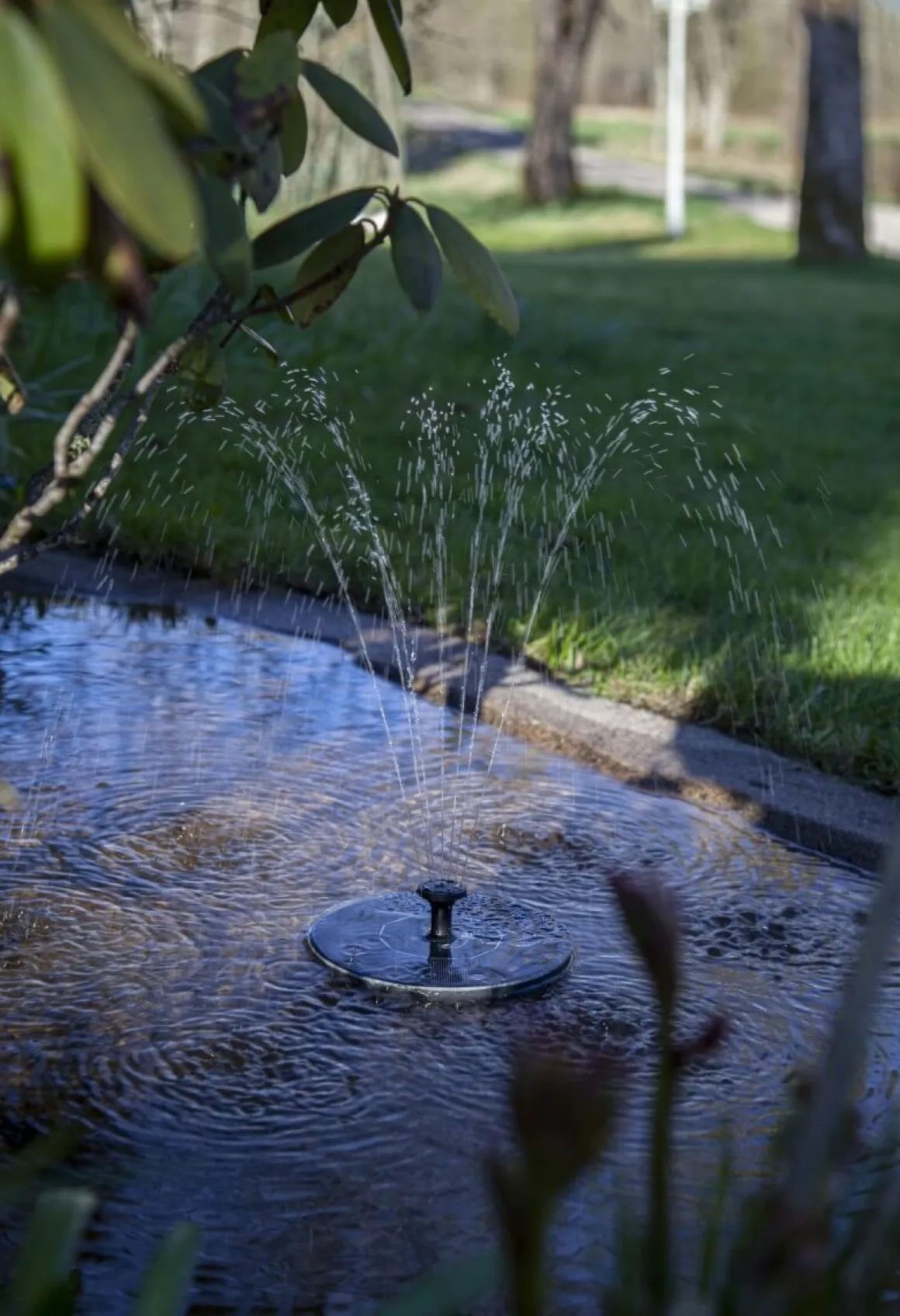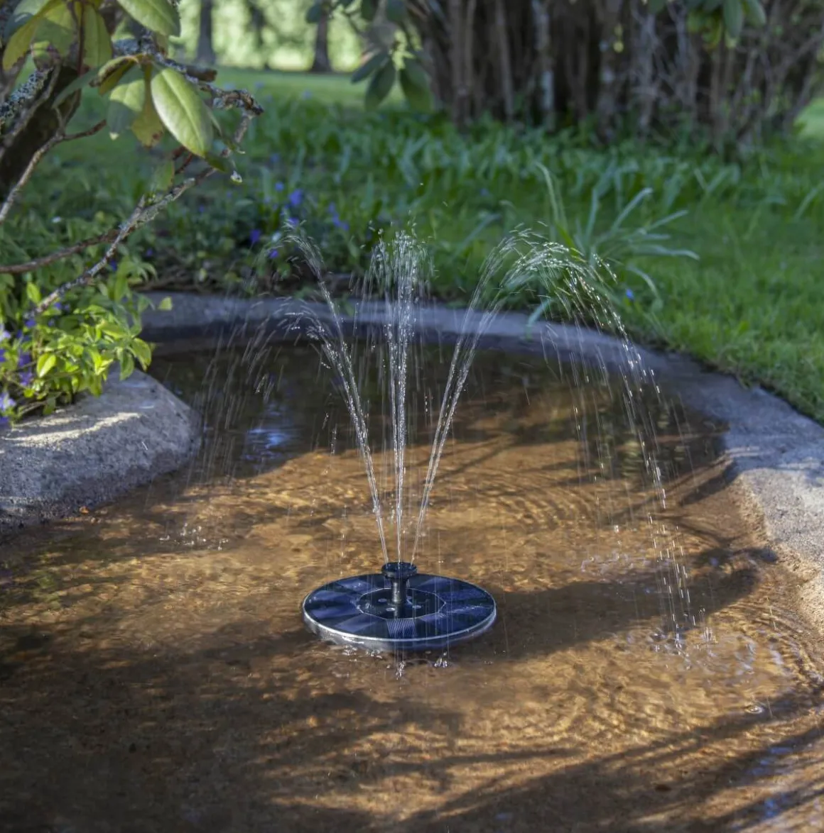Äntligen en fontän som drivs av solcellsenergi som laddar det medföljande batteriet. Solcellsfontänen passar för fågelbad eller en liten damm. Solcellspumpen levereras med 5 stycken olika munstycken som du kan byta mellan, pumpen placeras i botten på paneldelen och sist sätts kontakten från pumpen in själva solcellspanelen. Placera fontänen så att pumpen helt täcks av vatten och panelen med munstycke är placerad uppåt. Observera att pumpen EJ ska monteras innan det är dags att placera den i fågelbadet eller dammen, när solen laddar panelen så börjar vattnet att porla. När mörkret sedan faller så lyser även fontänen med olikfärgade LED lampor. Tänk på att fontänen endast fungerar om solen kommer åt att lysa på paneldelen så batteriet laddas.
