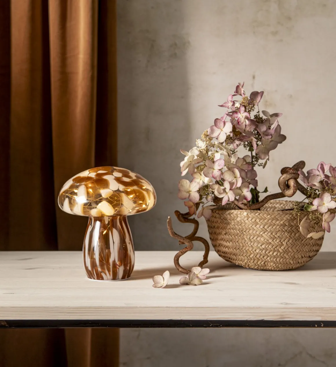 Så vacker bordsdekoration i form av en toksöt liten svamp i semitransparent brunfläckigt glas. Funghi finns i 2 storlekar och här ser du den stora av dem två. Batteriboxen göms diskret i foten. Funghi drivs av 2 st AAA batterier och har självklart en inbyggd timerfunktion så att du lätt kan ställa in när du vill att den ska lysa. Perfekt som dekoration på det dukade bordet. Batterier köpes separat.