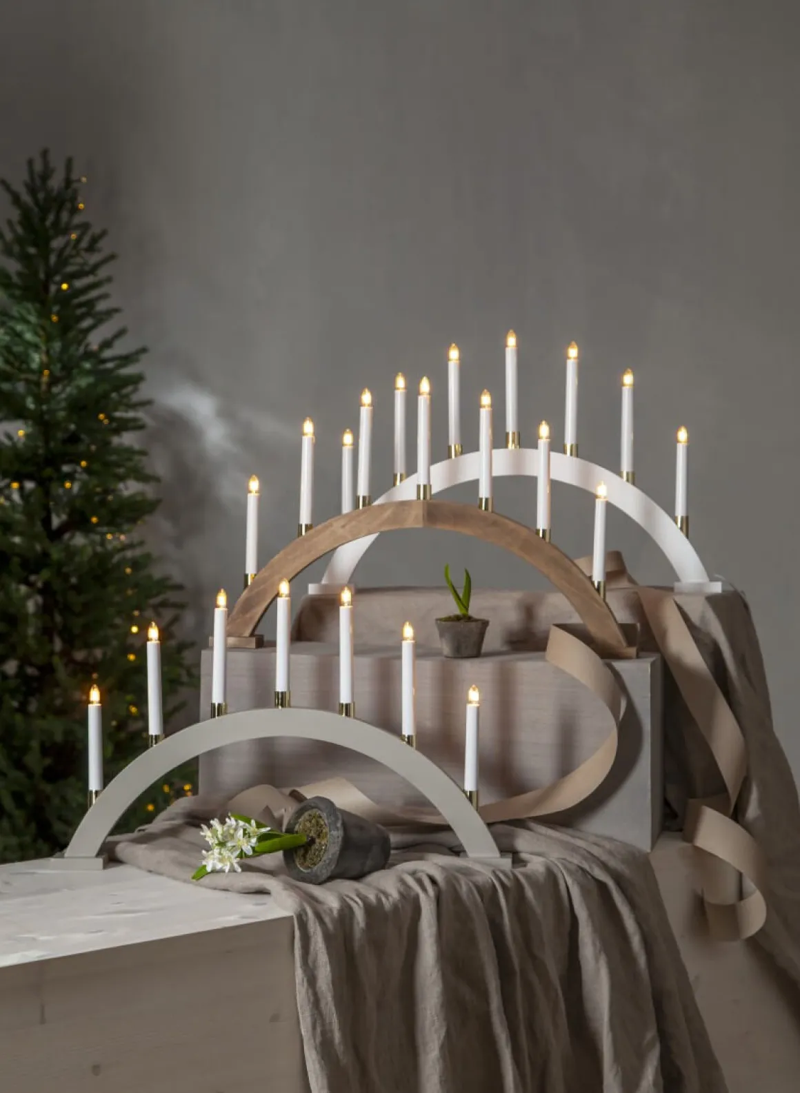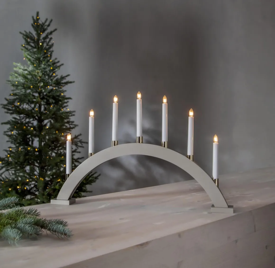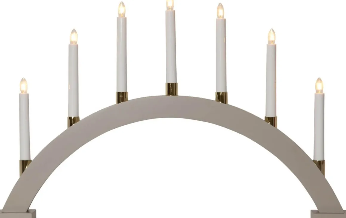 Beige stilren bågformad träljusstake med 7 stycken mässingbelagda ljushållare. Fin adventsljusstake att dekorera med till jul.