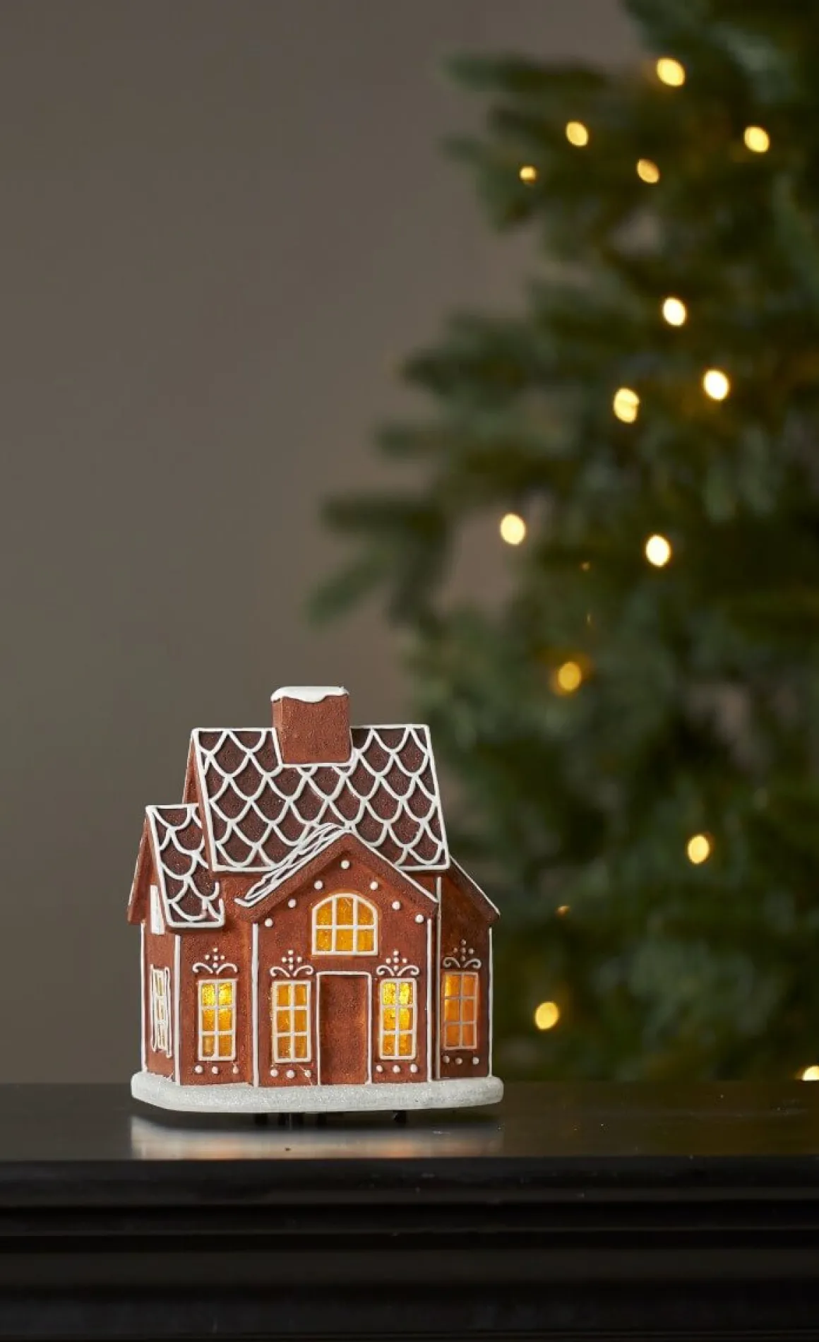 Så vackert litet batteridrivet pepparkakshus. Det lyser varmt och stämningsfullt i huset. Placera på en skänk eller på ett bord och få den där härliga julstämningen.