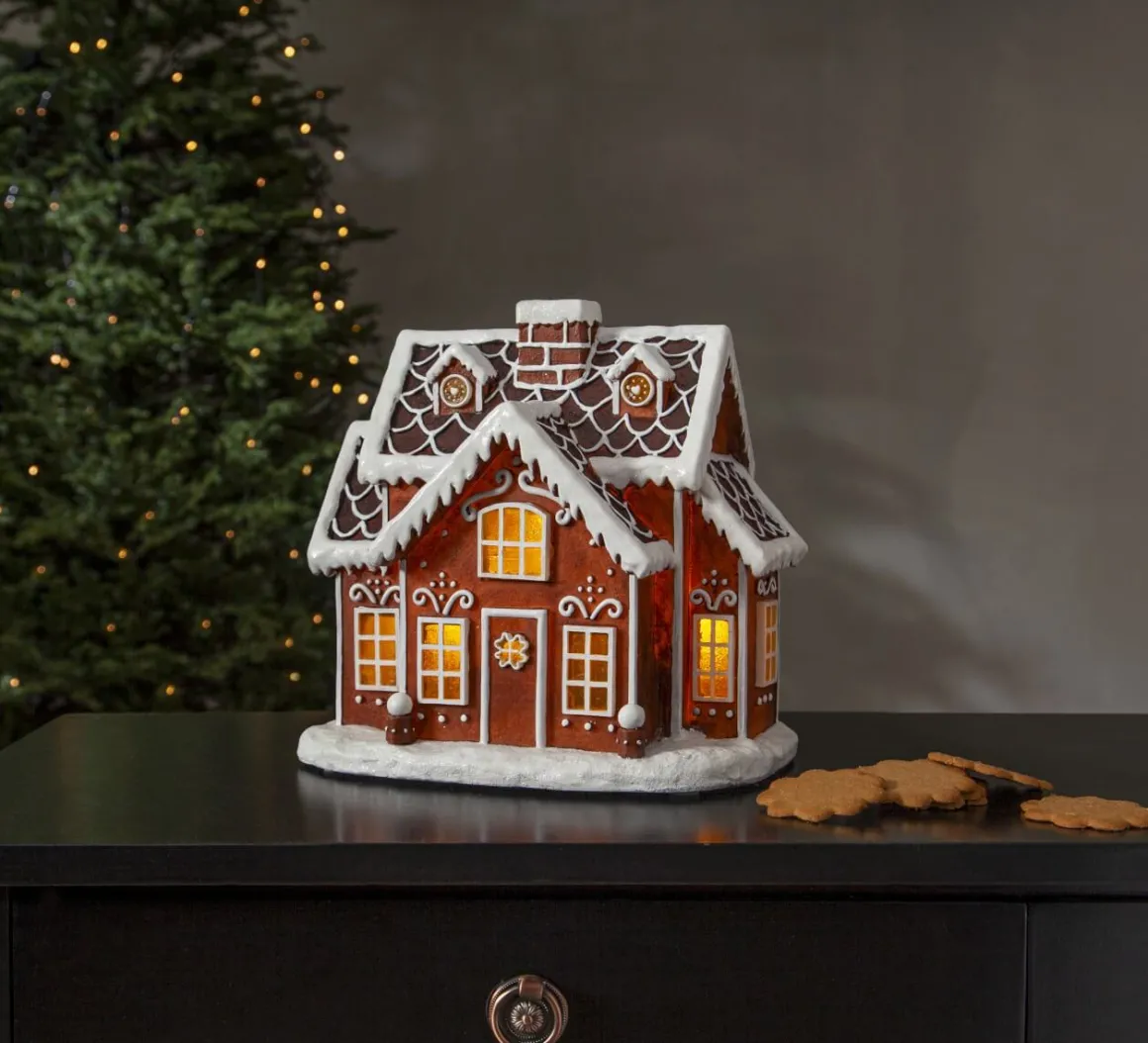 Så vackert litet batteridrivet pepparkakshus. Det lyser varmt och stämningsfullt i huset. Placera på en skänk eller på ett bord och få den där härliga julstämningen. Pepparkakshuset drivs antingen på el eller batteri, adapter medföljer.
