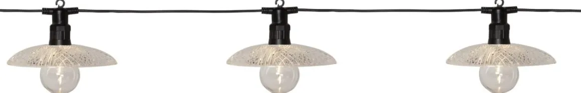 Exklusiv partyslinga med 6 lampor från Star Trading. Varje lampa har en söt liten skärm som ser ut som pressat glas. Förgyll uteplatsen eller trädgården med denna stiliga slinga som ger ett härligt sken. Svart kabel med 70cm mellan lamporna och 5 meter från sista lampan till kontakten.