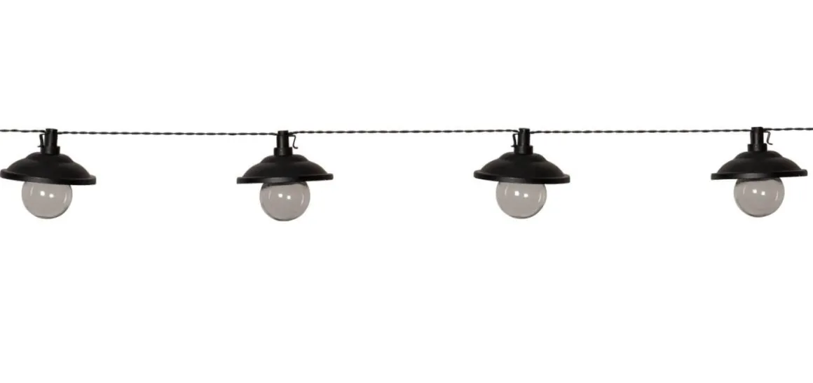 Globe Shade är en solcells slinga från Star Trading med 10 glober med skärm av svart metall. Globerna lyser upp i ett varmvitt behagligt sken. Det är 20 cm mellan varje dekoration. Den blir en vacker dekoration och är lättplacerad i en trädgård eller en balkong. Själva paneldelen sitter med 2 meters kabel från den sista lampan, detta gör det enkelt för dig att placera panelen i direkt solljus vilket är nödvändigt för att ladda batteriet som medföljer. Själva slingan går bra att ha i skuggan så länge panelen får solljus.