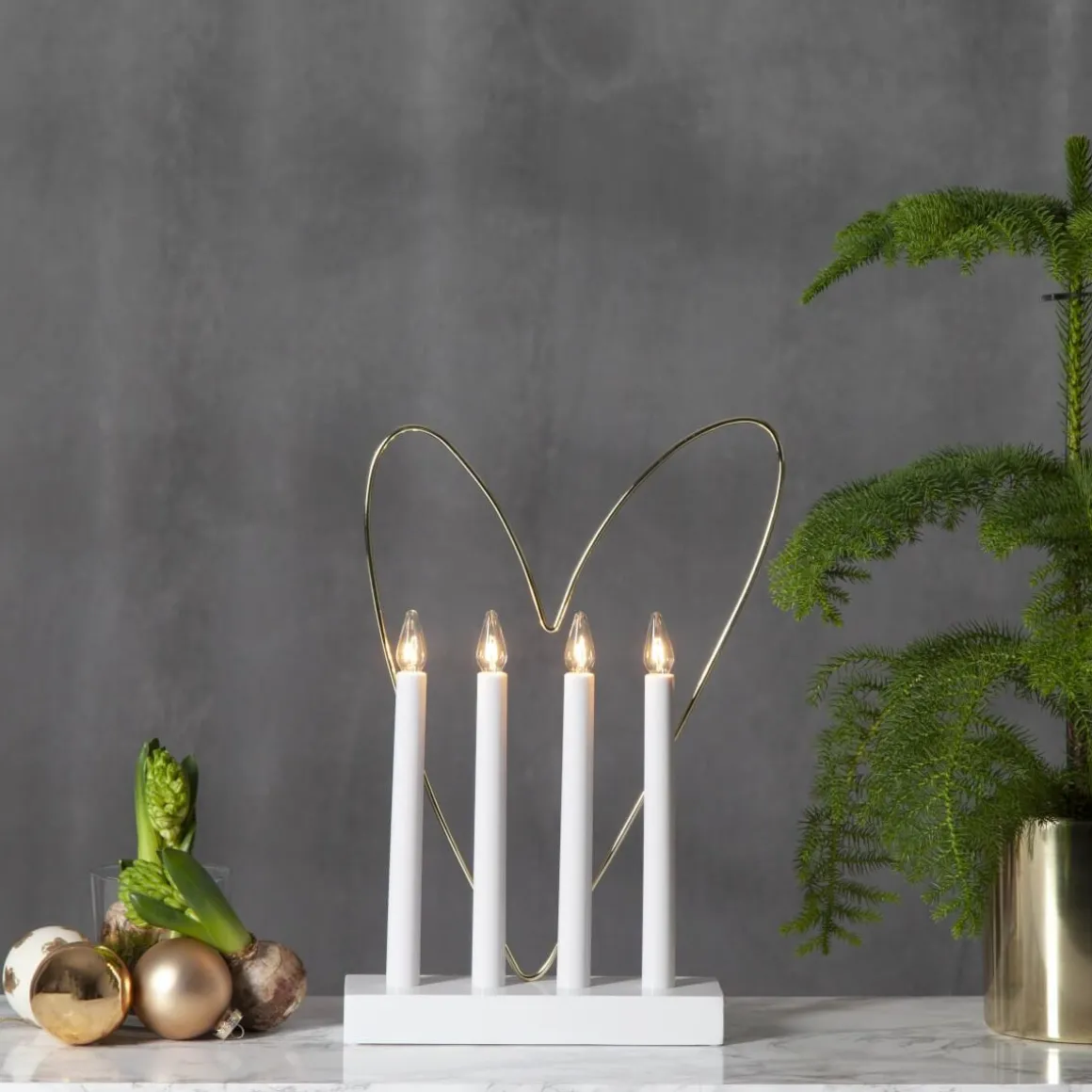 Så vacker liten ljusstake i vitt med ett dekorativt mässingshjärta som ger den det där lilla extra, en stor favorit julen 2019!