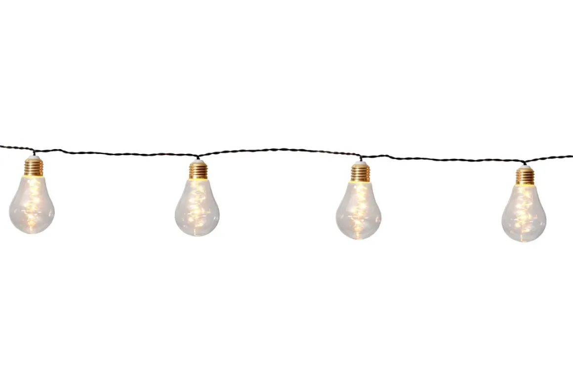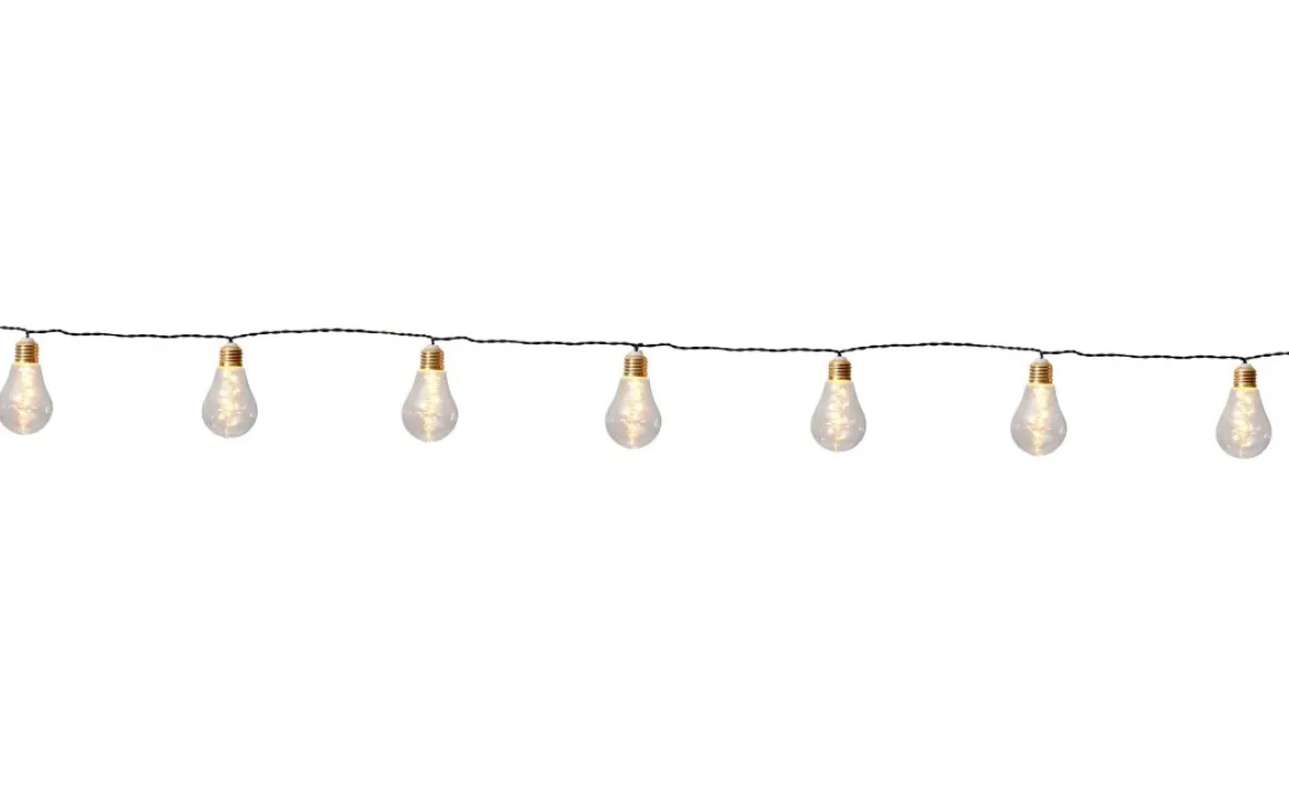 Som vi älskar denna dekorationsslinga, 10 stycken små lyktor i glas med formen av en glödlampa med en liten slinga i varje ”glödlampa” lyser vackert upp varthän du än placerar den! Den går fint att ha utomhus men då helst under tak.