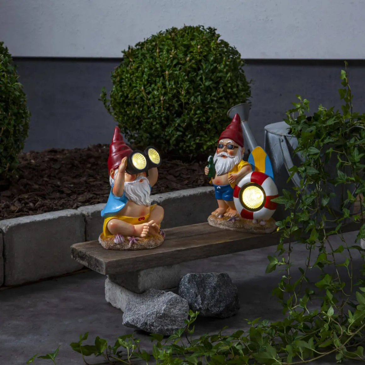 Älsk på denna lilla söta trädgårdstomte från Star Trading. Gnomy laddas upp av solens varma strålar för att tändas så fort mörkret kryper sig på, här ser du Gnomy med kikare men missa inte hans kompis med surfbräda och livboj.
