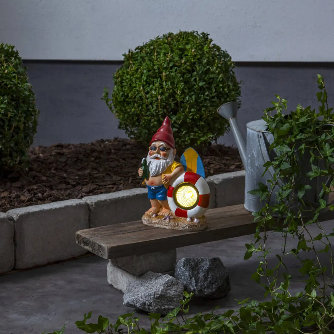 Älsk på denna lilla söta trädgårdstomte från Star Trading. Gnomy laddas upp av solens varma strålar för att tändas så fort mörkret kryper sig på, här ser du Gnomy med livboj men missa inte hans kompis med kikare.