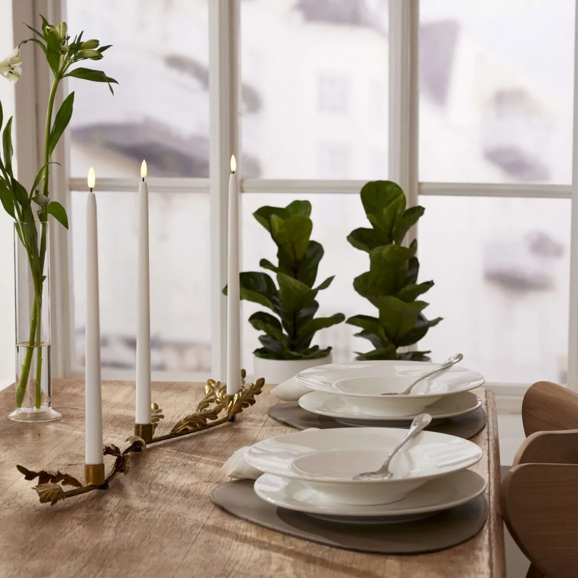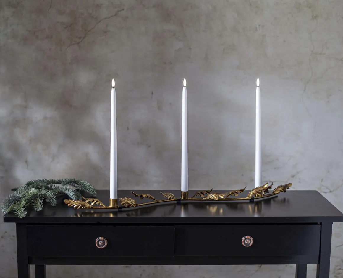 Designad av Charlotte Falck, denna eleganta adventsljusstake i metall är dekorerad med eklöv och har en vacker antik mässing-färg. Ljusstaken sprider ett fint sken i mörkret och är perfekt för både höst och vinter. En tidlös klassiker som tas fram år efter år. För bästa resultat, använd ljusstaken med våra batteridrivna ljus.