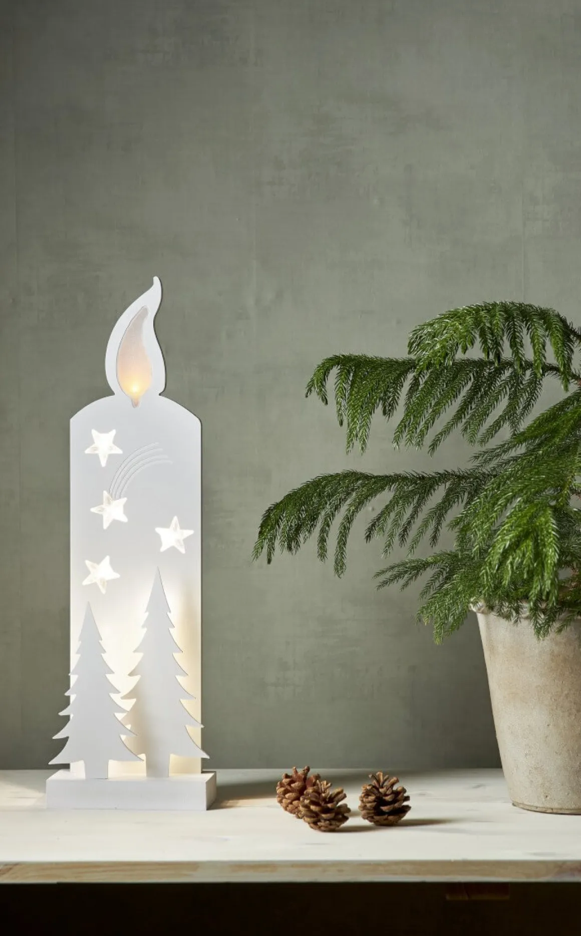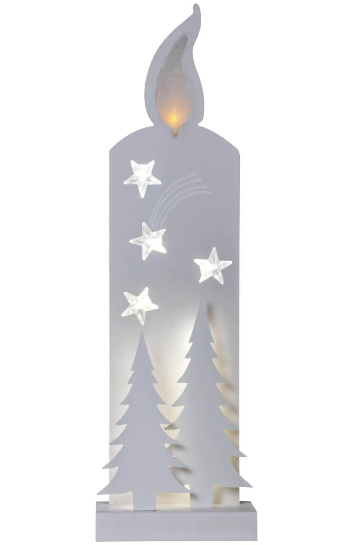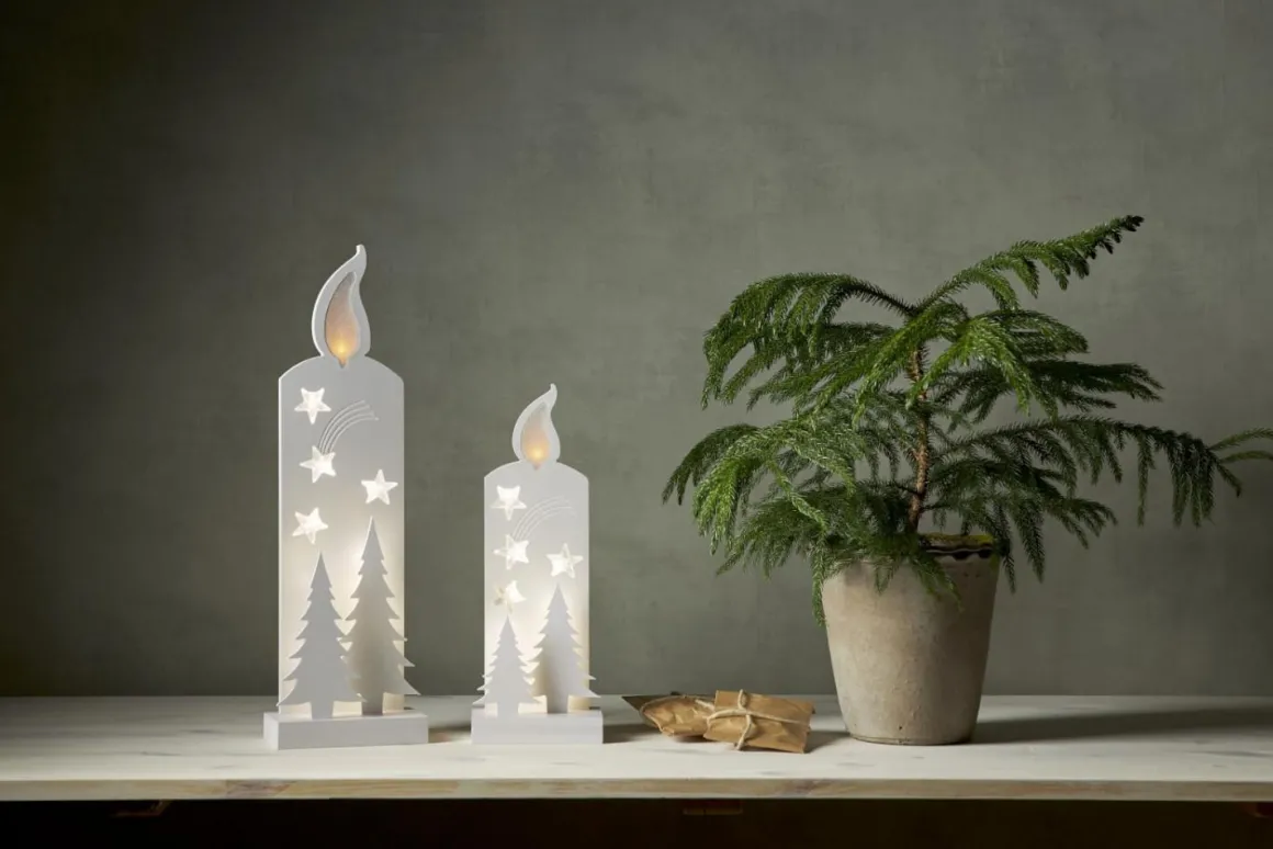 Lysande vackra vita silhuetter 50cm hög. Silhuetterna visar ett ljus och två granar. Led ljus lyser i ljusets låga såklart och i stjärnorna och mellan siluetterna vilket ger en vacker skimrande effekt. Placera i ett fönster eller mot en vägg för en krispig vit julkänsla. Här ser du stora dekorationen på 50 cm.