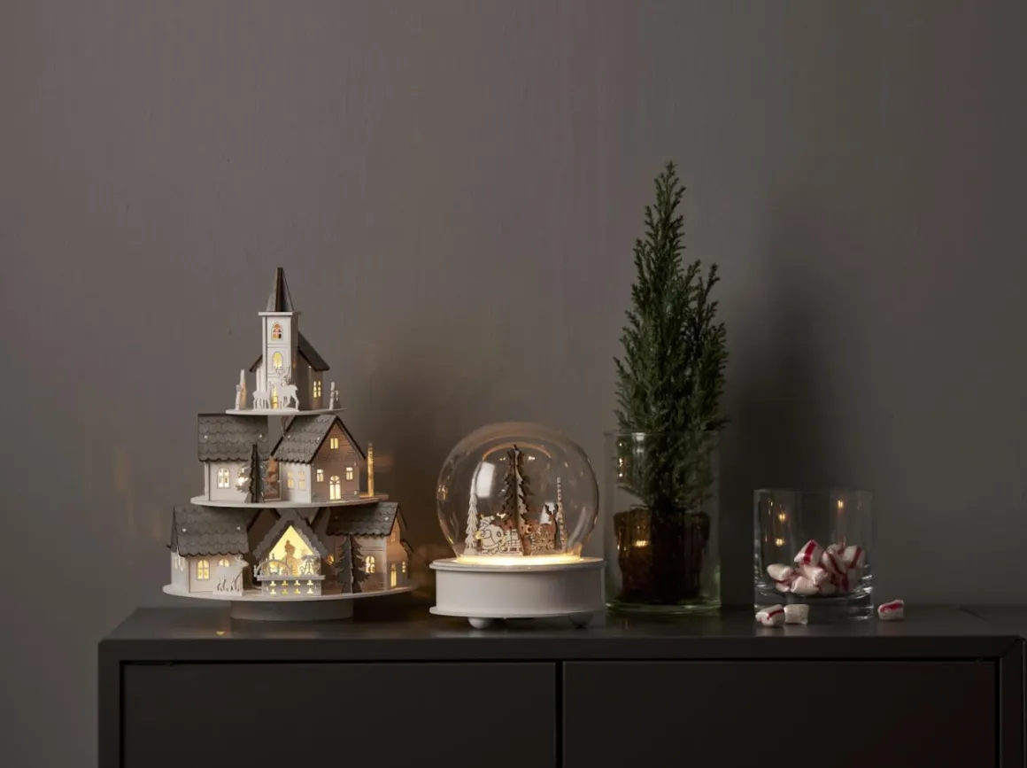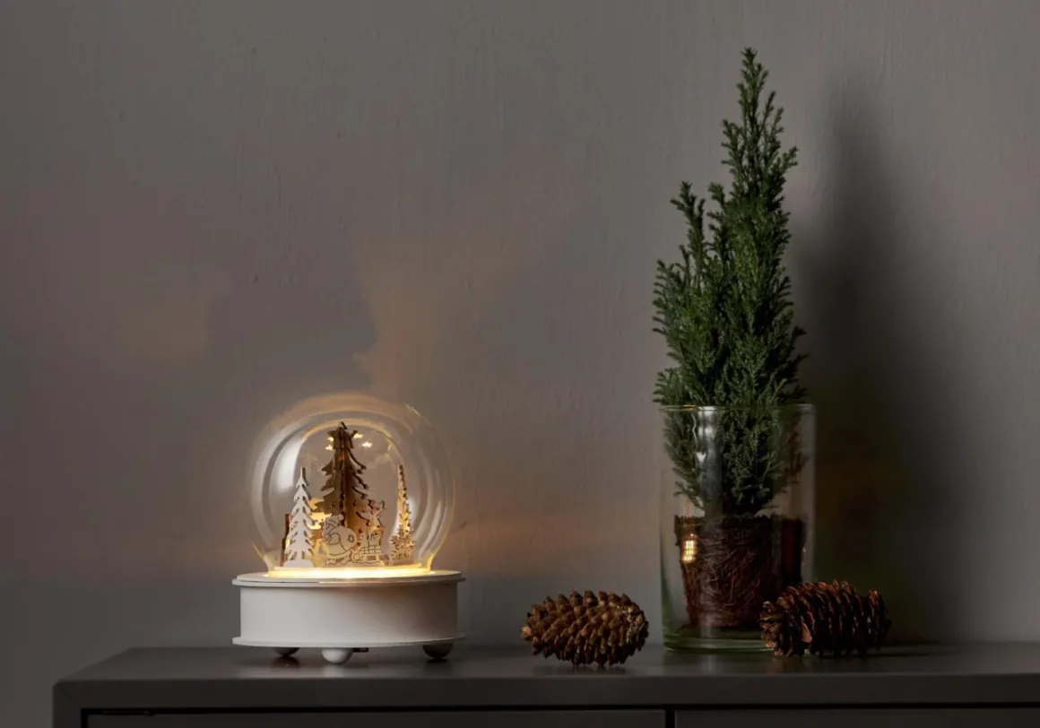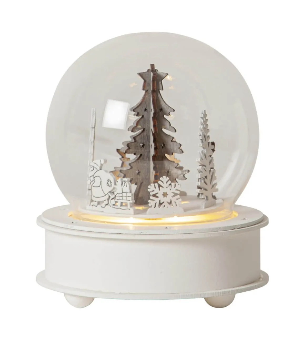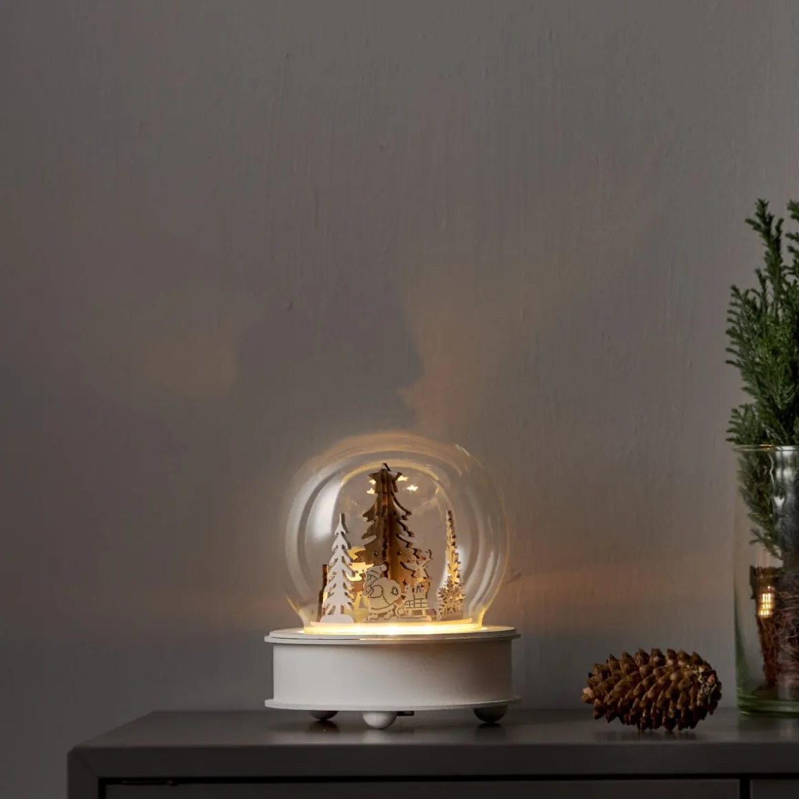 Underbart detaljrik laserskuren speldosa med glaskula från Star Trading, vackert utskuret landskap som lyser och roterar när produkten är påslagen. Vrid på vredet på speldosan och lyssna när det sedan spelar en vacker melodi. Dekorera till advent och jul, placera speldosan i ett fönster eller på en byrå för att få den perfekta julkänslan.
