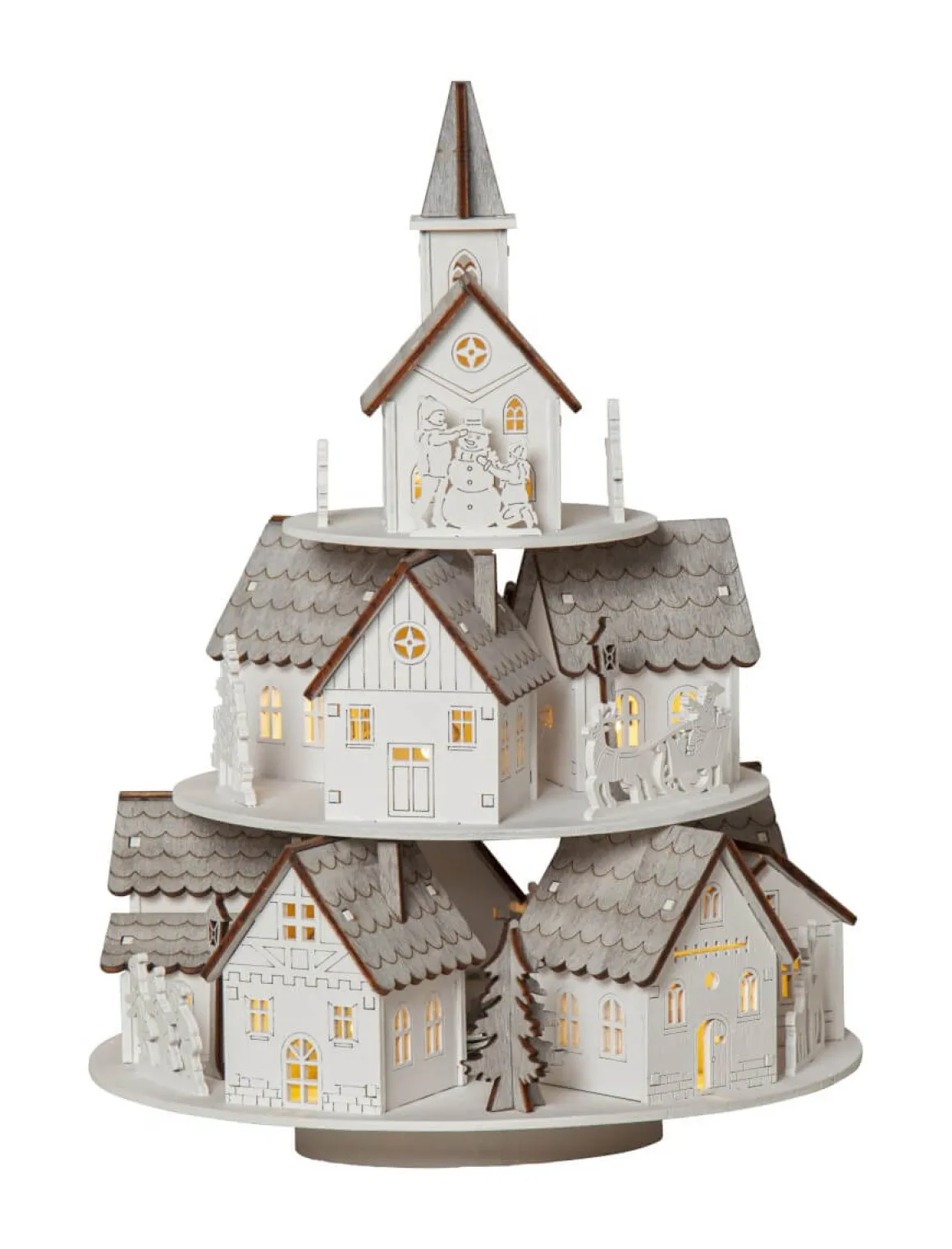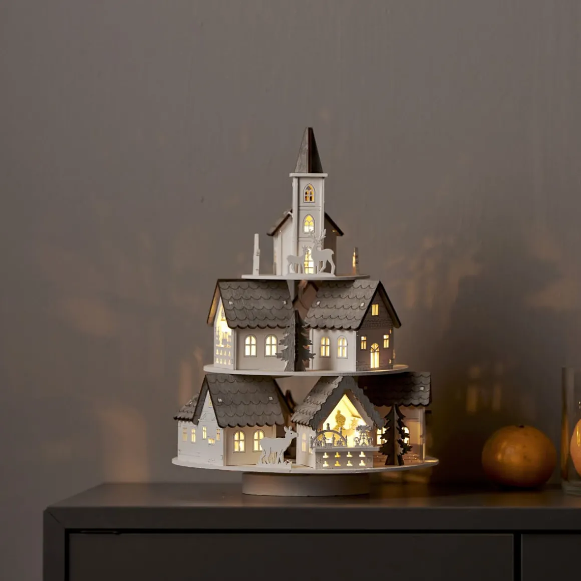 Underbart detaljrik laserskuren speldosa i trä med tre våningar från Star Trading, vackert utskuret landskap och små hus som lyser när produkten är påslagen.Vrid på basen på speldosan och lyssna när det sedan spelar en vacker melodi samtidigt som den roterar. Dekorera till advent och jul, placera ljusstaken i ett fönster eller på en byrå för att få den perfekta julkänslan.