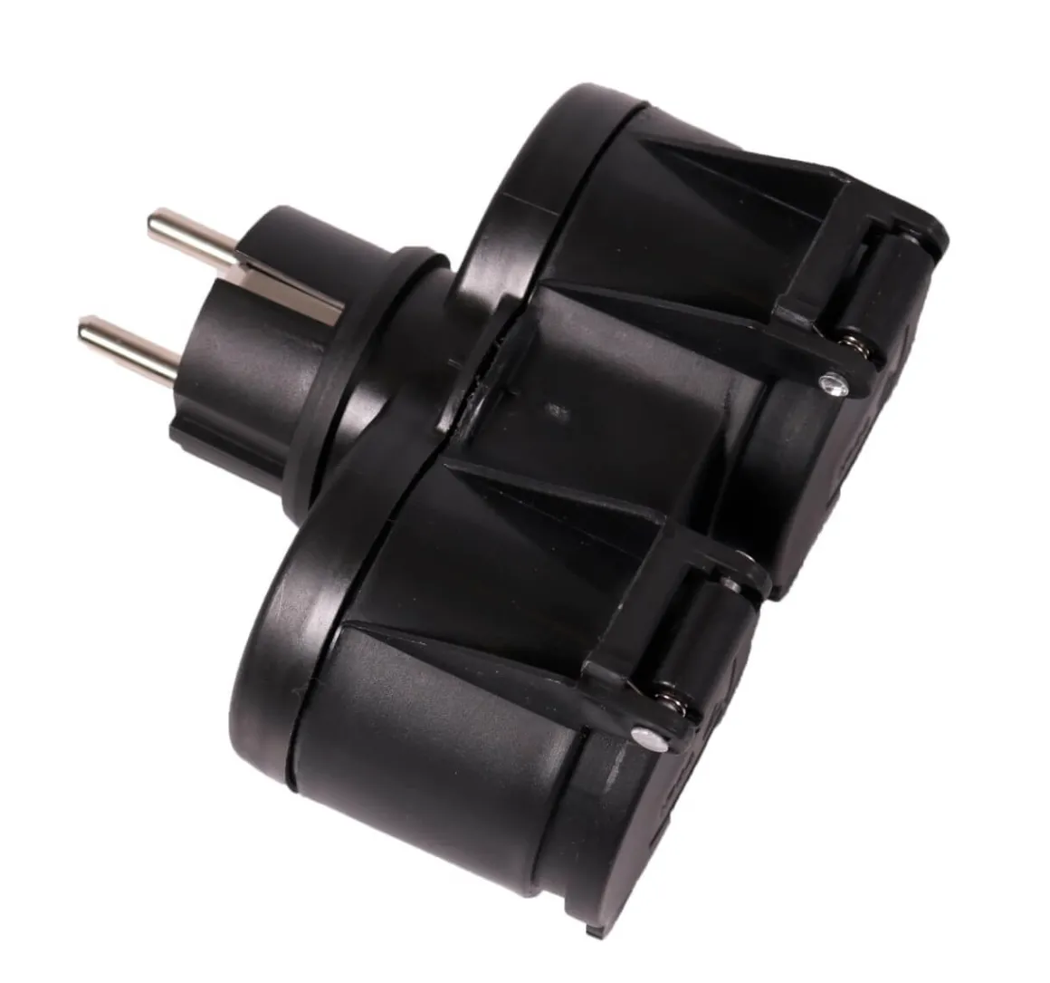 Dubbelt svart grenuttag med lock för utomhusbruk.