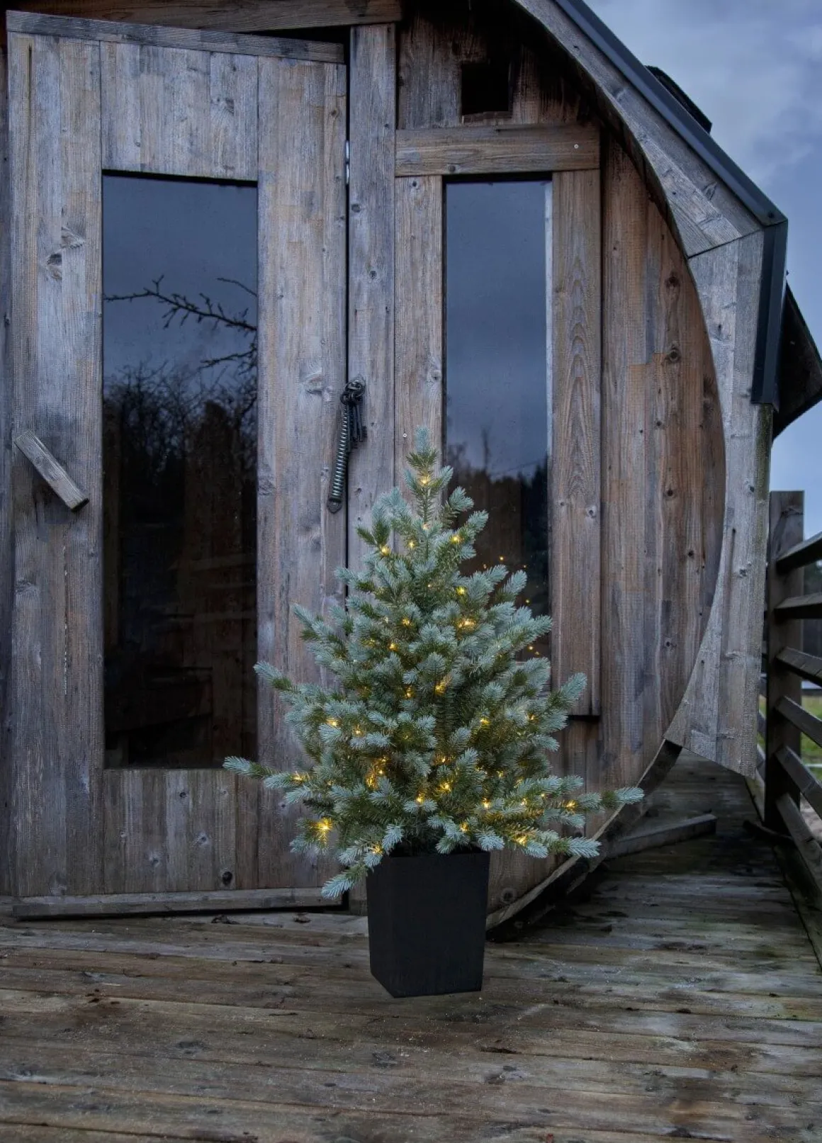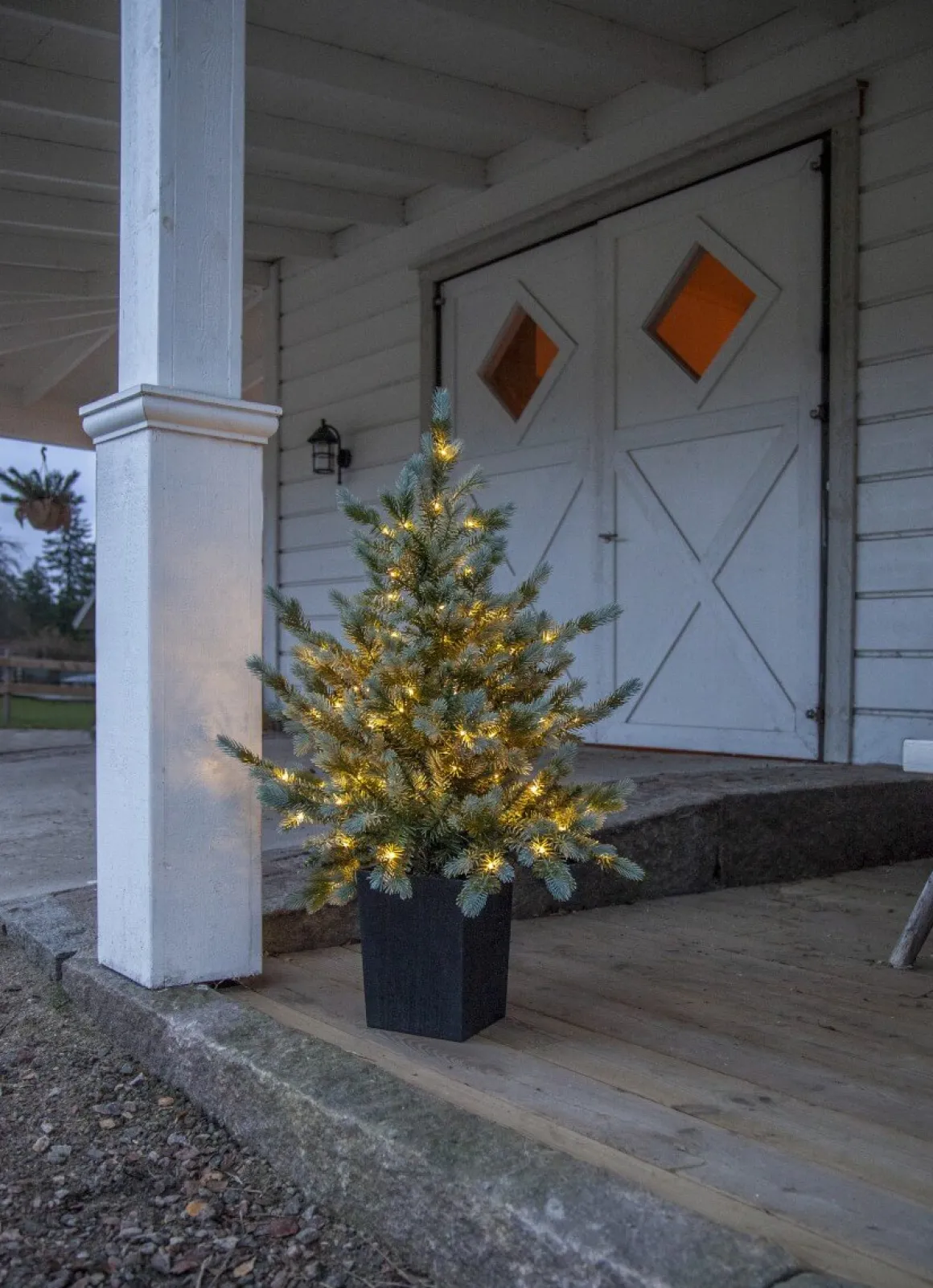 Granen Greyland från välkända Star Trading är ca 90 cm hög och 70 cm bred. Den är tillverkade av en mix av PE tips och PVC tips med ett vackert grå-grönt utseende. Grenarna sitter fast i lager och ger ett vackert fluffigt utseende. Med 80 små varmvita ljuspunkter lyser den upp vackert på en trapp eller inomhus där man önskar en mindre gran. Slingan kan både lysa konstant eller sättas med timer som lyser upp i 6 timmar och är släckt 18 timmar för att sedan tändas igen nästa dag. Den drivs av 3st AA batterier. Den svarta krukan medföljer och är ca 17x23cm.I samma familj finns även en stor gran, kransar och en girlang. Batterier köpes separat.