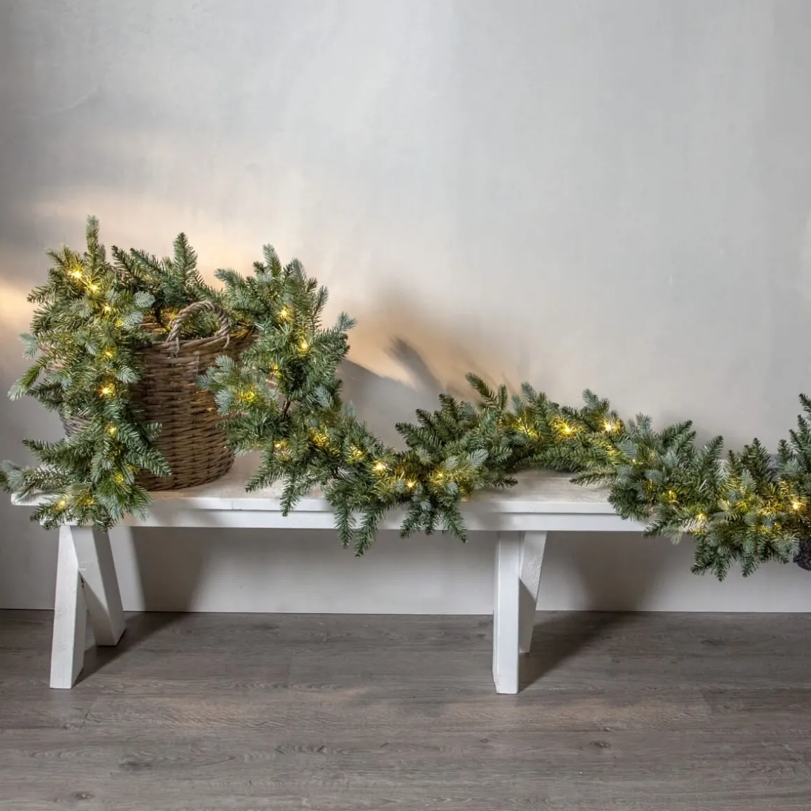 Greyland är en grangirlang på ca 300 cm lång och 20 cm bred. Den är tillverkade av en mix av PE tips och PVC tips med ett vackert grå-grönt skimrande utseende. Med 60 små varmvita ljuspunkter lyser den upp vackert både inomhus och utomhus. Slingan kan både lysa konstant eller sättas med timer som lyser upp i 6 timmar och är släckt 18 timmar för att sedan tändas igen nästa dag. Den drivs av 3st AA batterier. I samma familj finns även granar och kransar. Batterier köpes separat.