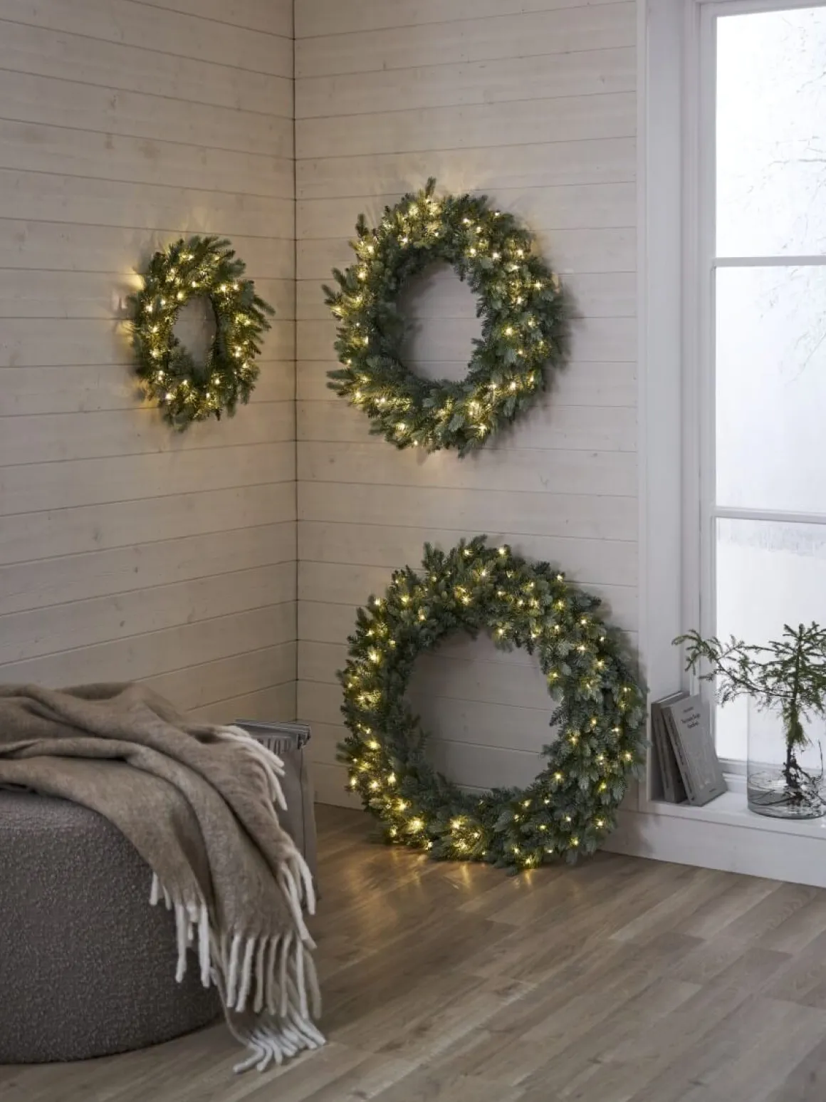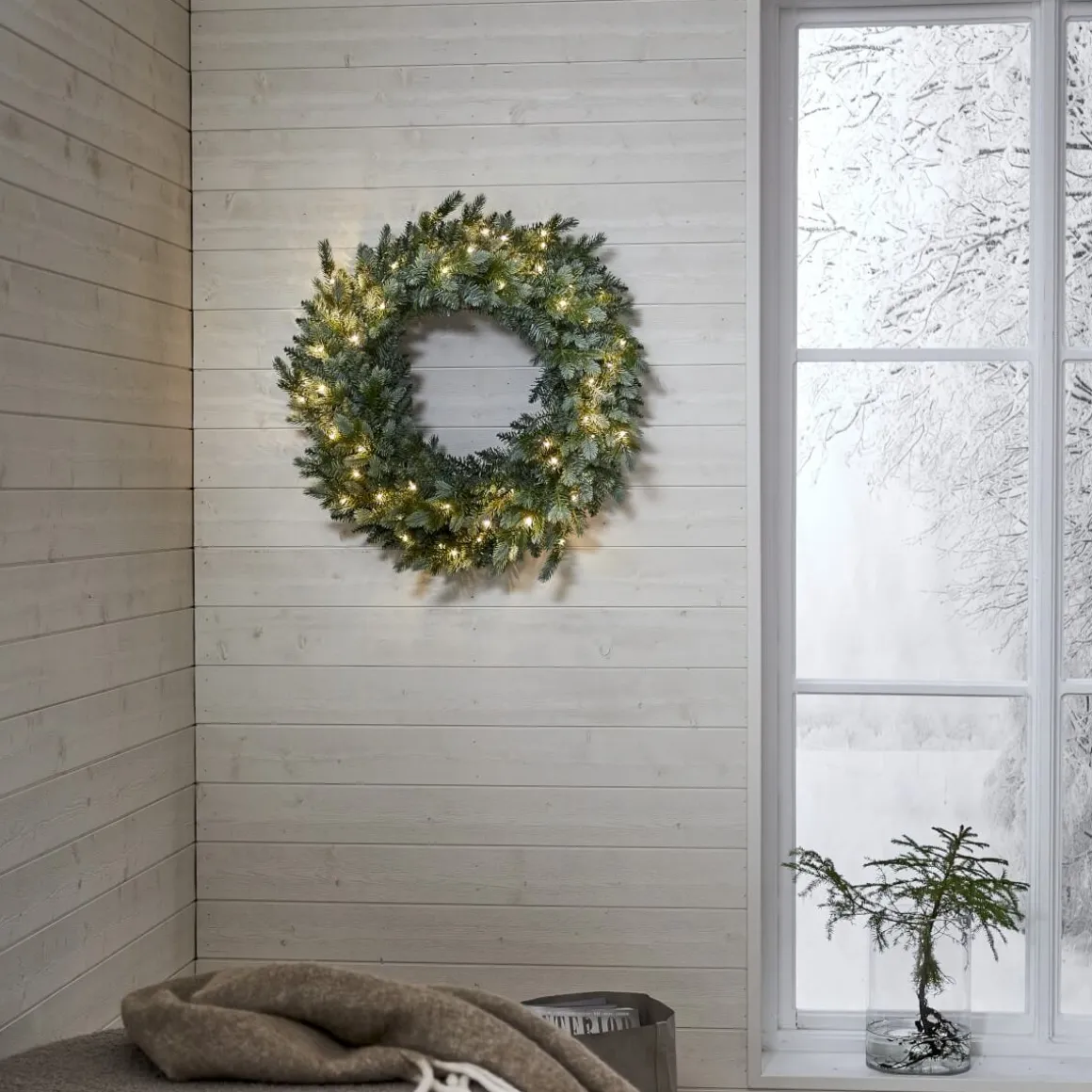 Greyland är en vacker krans på ca 80 cm i diameter.Tillverkade av en mix av PE tips och PVC tips med ett vackert grå-grönt skimrande utseende. Med 60 små varmvita ljuspunkter lyser den upp vackert både inomhus och utomhus. Slingan kan både lysa konstant eller sättas med timer som lyser upp i 6 timmar och är släckt 18 timmar för att sedan tändas igen nästa dag. Den drivs av 3st AA batterier. I samma familj finns även granar, fler storlekar på kransar och en girlang. Batterier köpes separat.