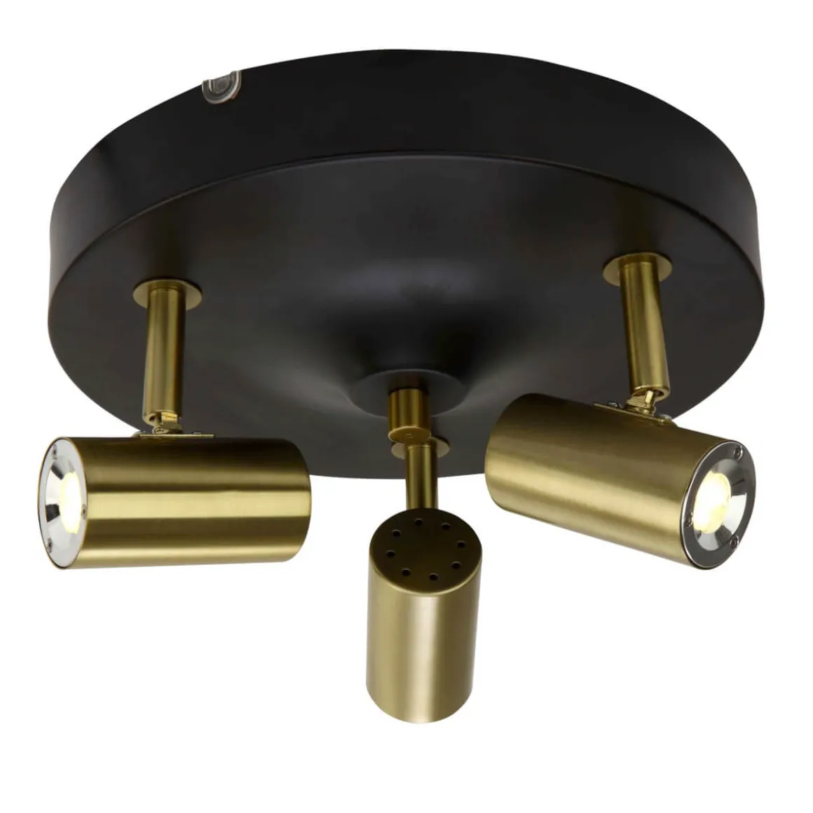 Modern och stilren takspot från Aneta belysning med 3 stycken riktbara spottar på en rund svart stomme med lamphuvuden i läcker mattmässing. Gusto levereras med integrerad LED på 5W vardera med en färgtemperatur på 3000K och ett ljusflöde på 400 lumen så lyser Gusto med enkelhet upp ett rum.