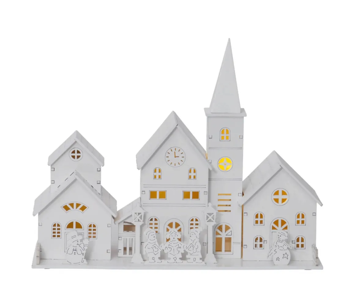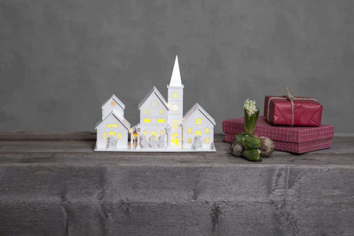 Så härlig liten laserskuren by, helvit med ett härligt varmt sken som strömmar ut genom fönsterna. Drivs gör den med 2 stycken AA batteri så du kan placera den vart du vill! Toppen!