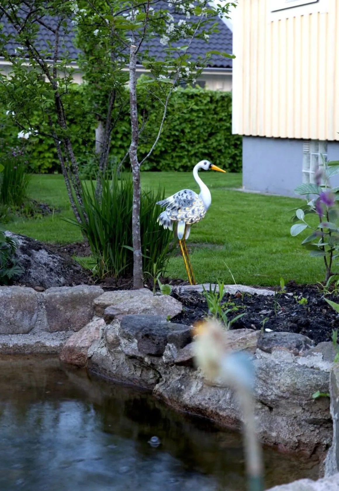 Så vacker solcellsdekoration i form av en häger, vackra detaljer i den målade metallen ger den ett extra lyft. Laddas upp av solen under dagen så den lyser inuti kroppen under natten med varmvitt sken.