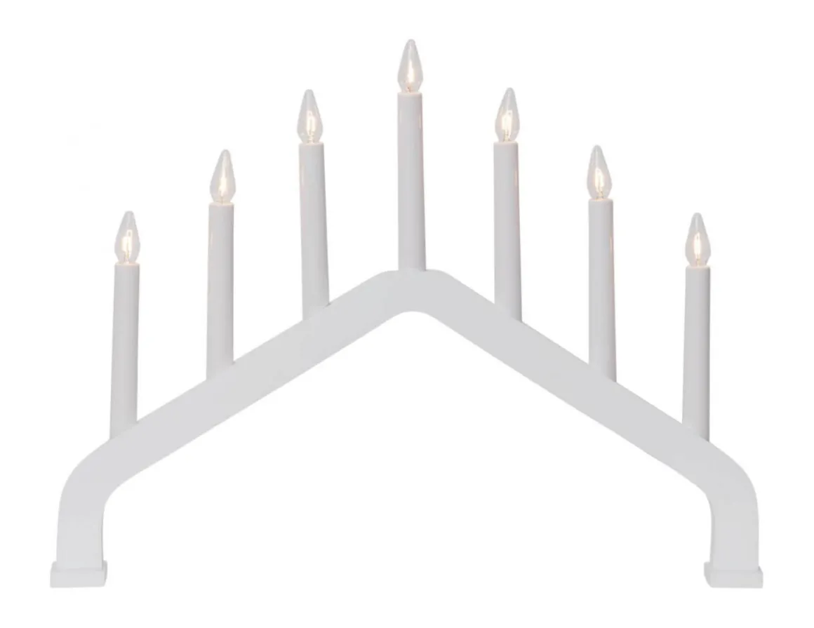 Vit träljusstake i stilren och enkel design och form med sju ljus för inomhusbruk.