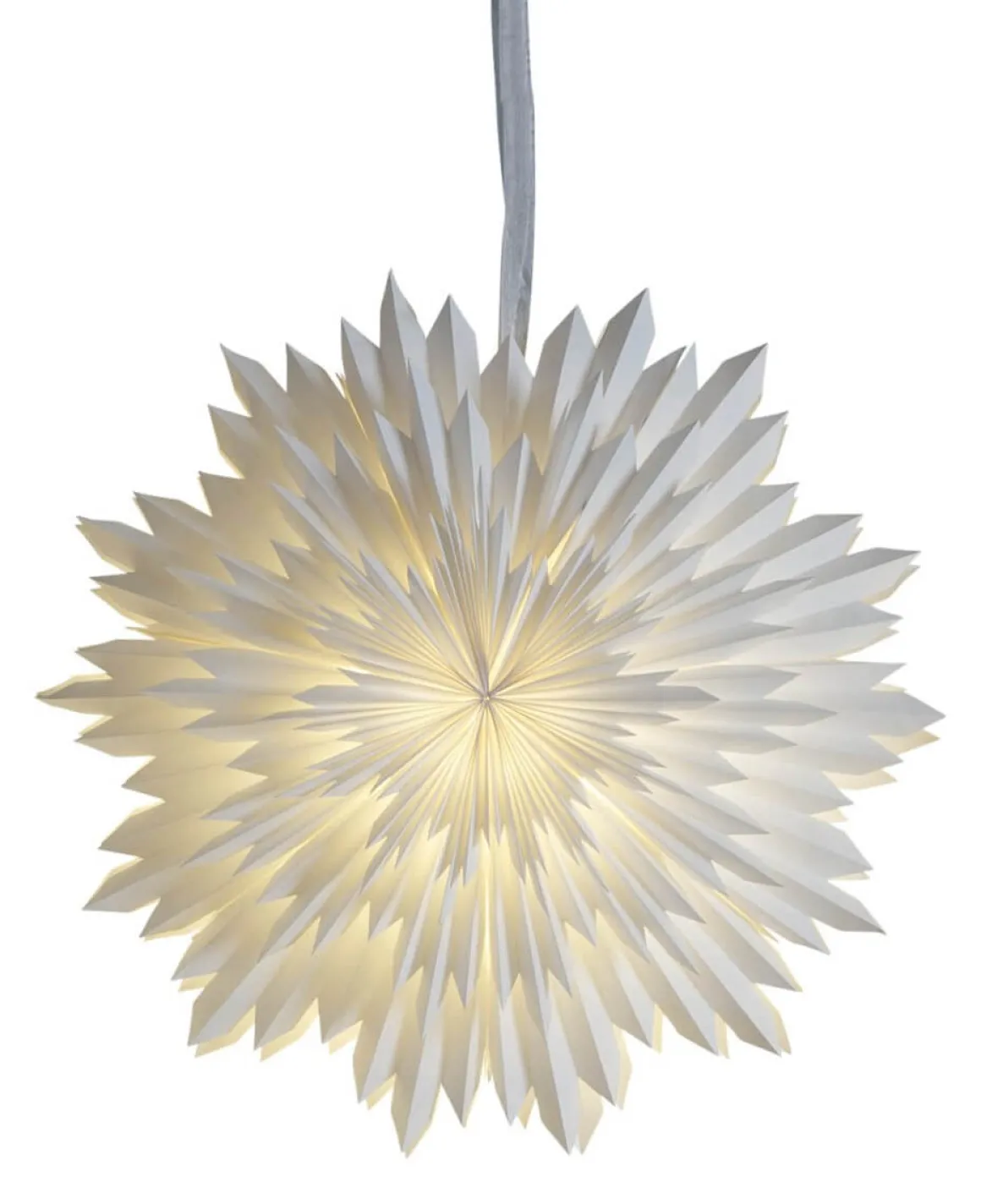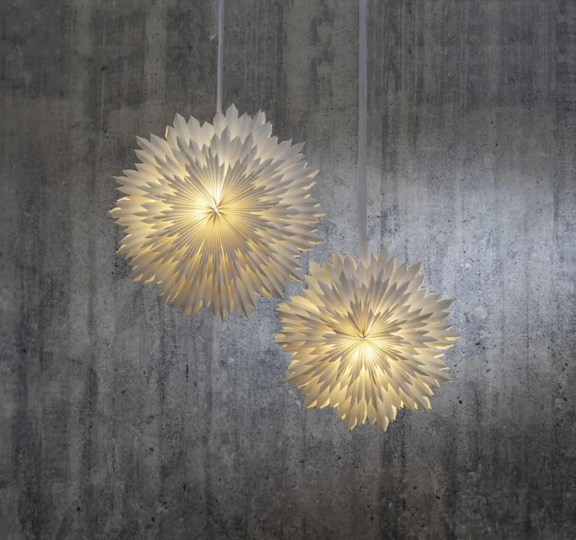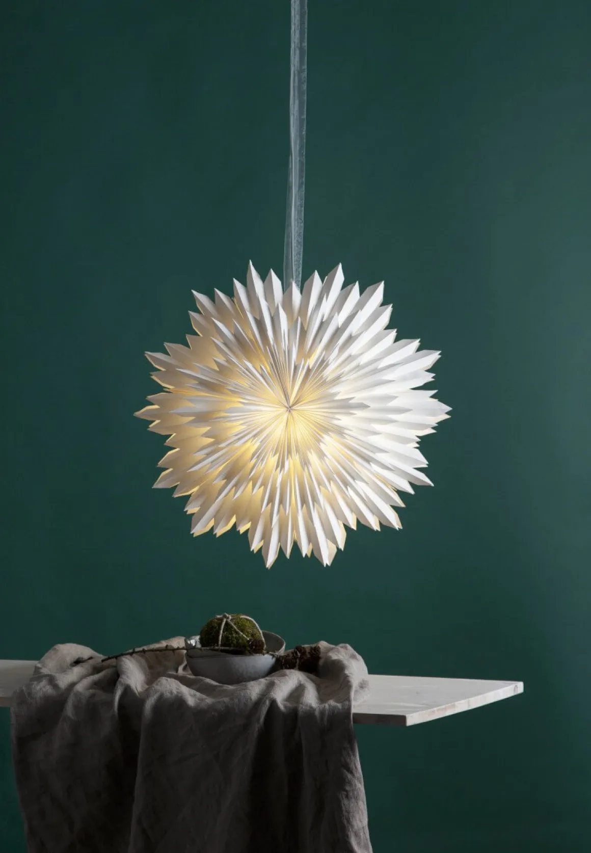 Fantastisk vit pappersstjärna från Star Tradin som är tillverkad av tre lager veckat vitt papper. Konturen är lite ojämn för en vintrigare känsla. Ett elegant band ingår för att lättare kunna hänga upp stjärnan. Stjärnan sprider stämning och ger hemmet den där speciella julkänslan. Kan hängas både i fönster och mot en vägg, bara din fantasi sätter gränserna. sladdställ köpes separat.