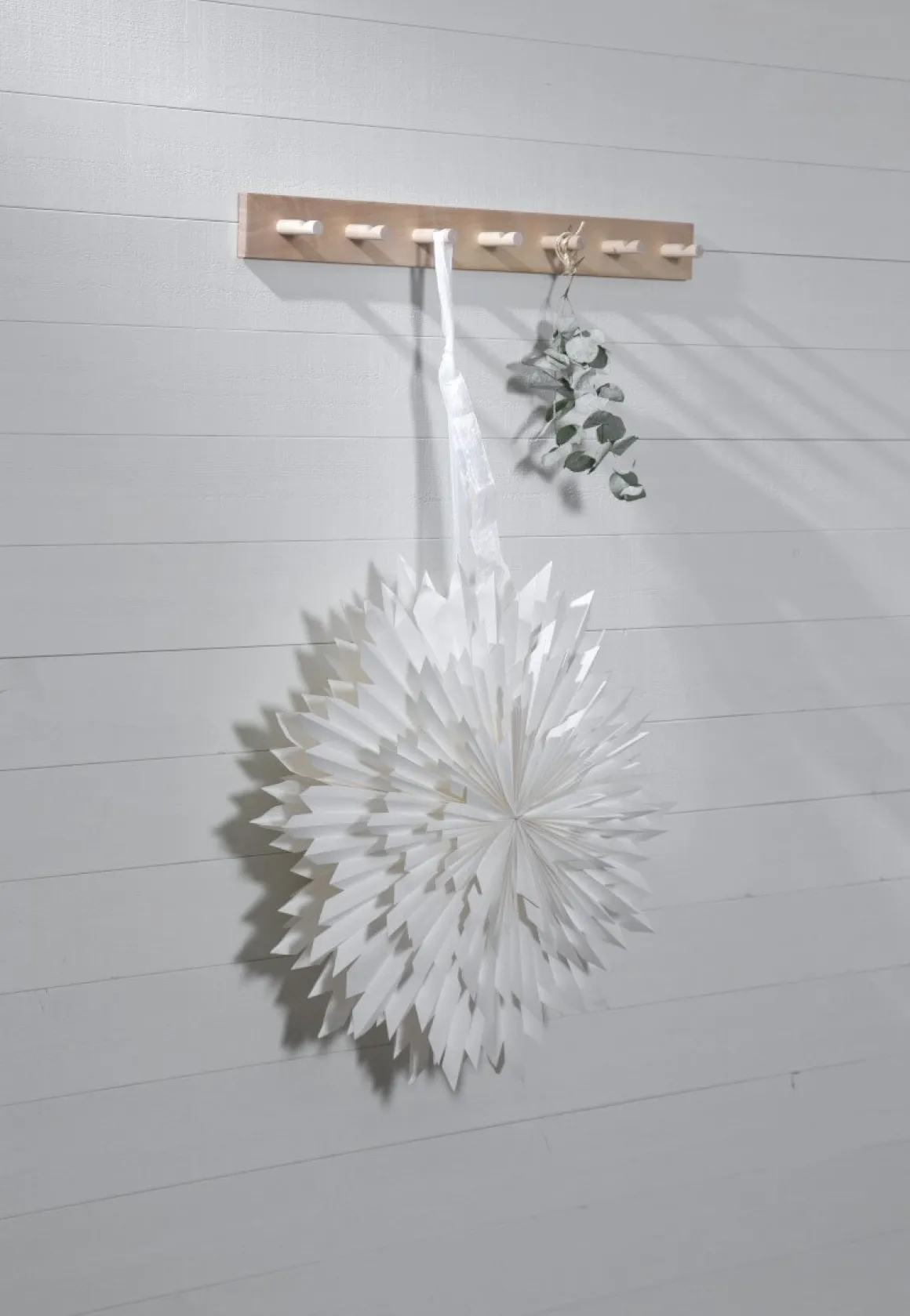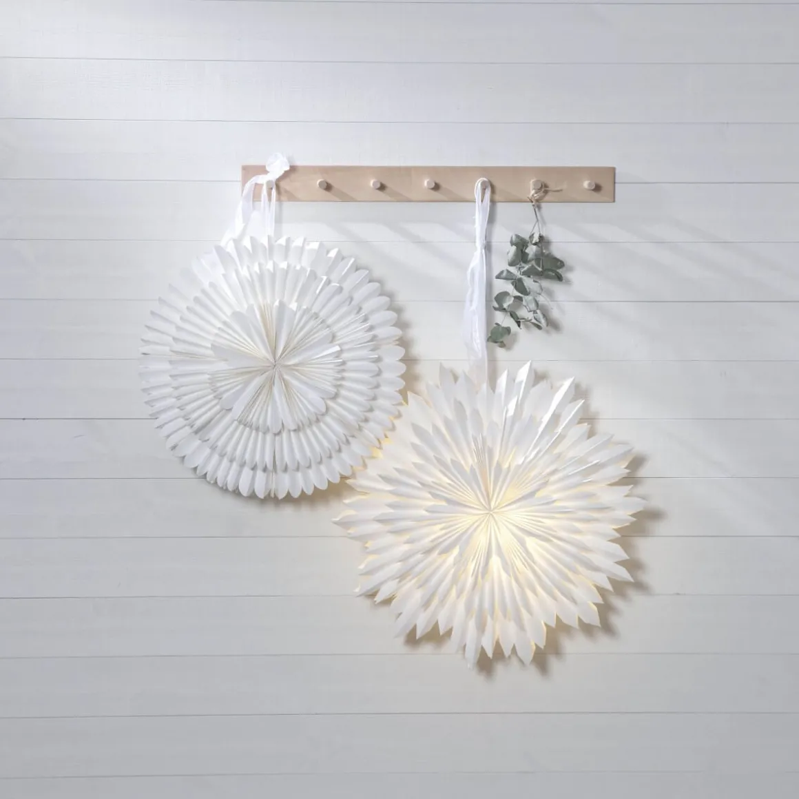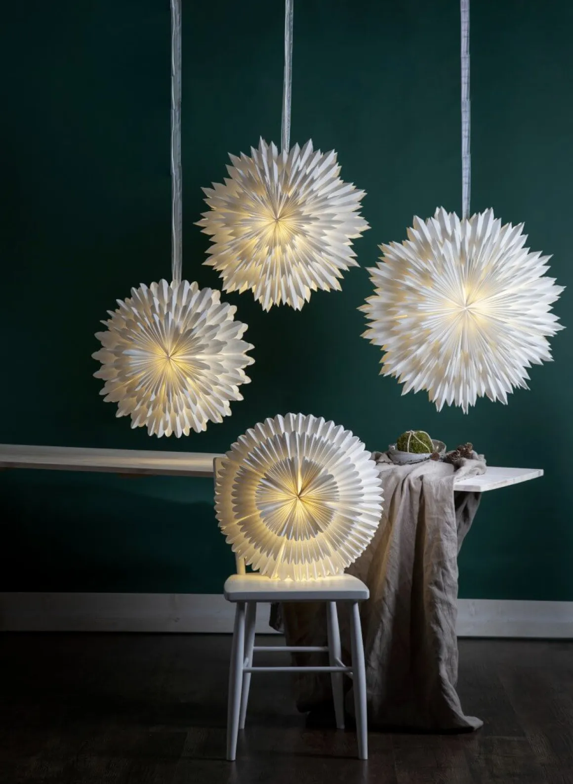 Fantastisk vit pappersstjärna från Star Tradin som är tillverkad av tre lager veckat vitt papper. Konturen är lite ojämn för en vintrigare känsla. Ett elegant band ingår för att lättare kunna hänga upp stjärnan. Stjärnan sprider stämning och ger hemmet den där speciella julkänslan. Kan hängas både i fönster och mot en vägg, bara din fantasi sätter gränserna. sladdställ köpes separat.